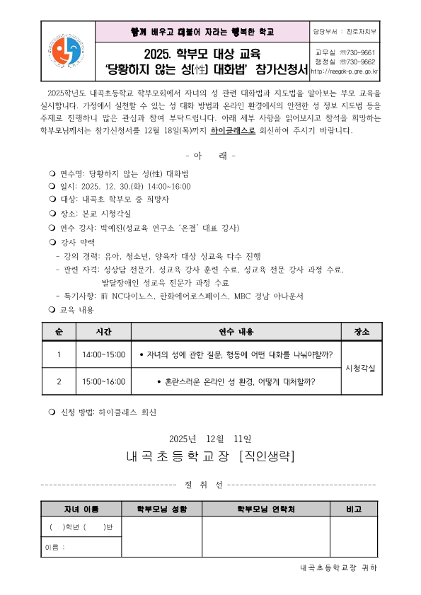 2025. 내곡초 학부모 연수 '당황하지 않는 성(性) 대화법' 안내