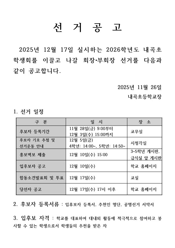 2026학년도 전교임원선거 후보자 등록 공고