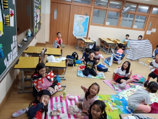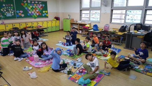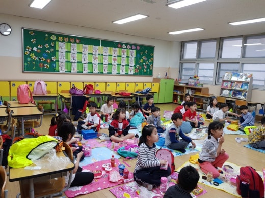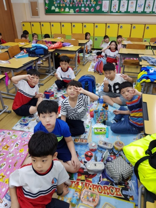 - 학교로 돌아와 교실에서 도시락과 간식을 나누어 먹었습니다. 점심 식사 후에는 각 반에서 스타와 팬 게임, 교실 피구, 수건 돌리기 등 교실 놀이 활동을 함께 했습니다.