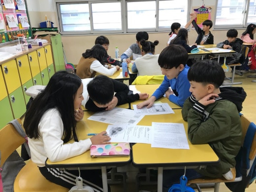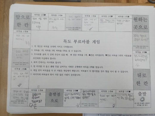 또한 1학기에 했던 독도 조사 활동지를 활용하여 독도 부르마블 게임을 만들었습니다. 학생들은 스스로 문제를 만들고 게임을 하며 독도에 대한 지식을 다시 한번 정리하였습니다. (게임 활동을 할 때는 옆 모둠이 만든 부르마블 게임판을 사용) 또한 독도 관련 동화책을 학생들에게 읽어주고 퀴즈 풀기 활동 및 독도 추리 게임을 한 학급도 있었습니다.