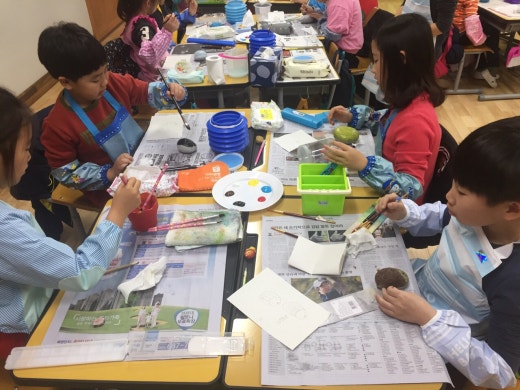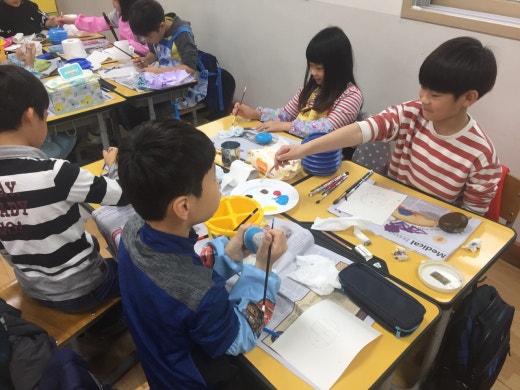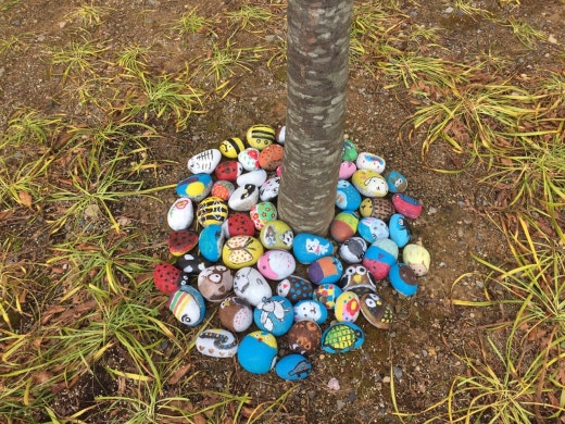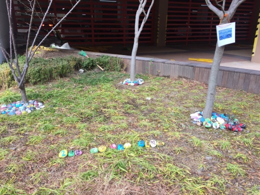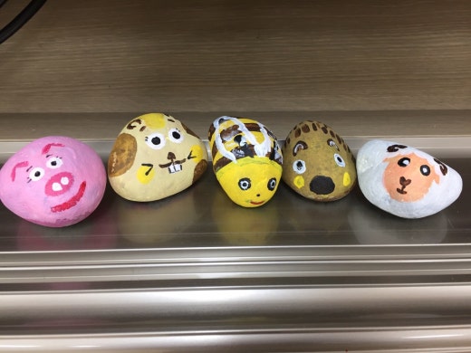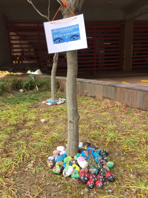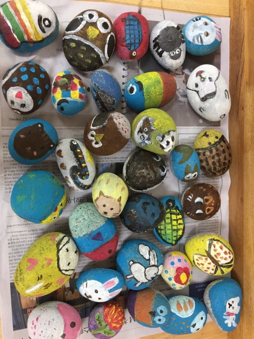 2학년 통합 교과 ‘겨울’에는 동물들의 건강한 겨울나기 수업이 있는데 이를 더 확장하여 인간과 동식물이 공존하는 지구에서 함께 잘 살기위한 생명공동체 프로젝트를 계획했습니다. 먼저 지구 환경 문제를 알아보고 다양한 동물 축제에서 ‘동물’들이 괴롭힘을 당하는 현실을 짚어보고 우리들의 가져야 할 올바른 마음가짐과 자세를 약속한 후 이를 스톤아트로 표현했습니다. 아크릴 물감으로 작업한 작품이라 야외 전시가 가능합니다.