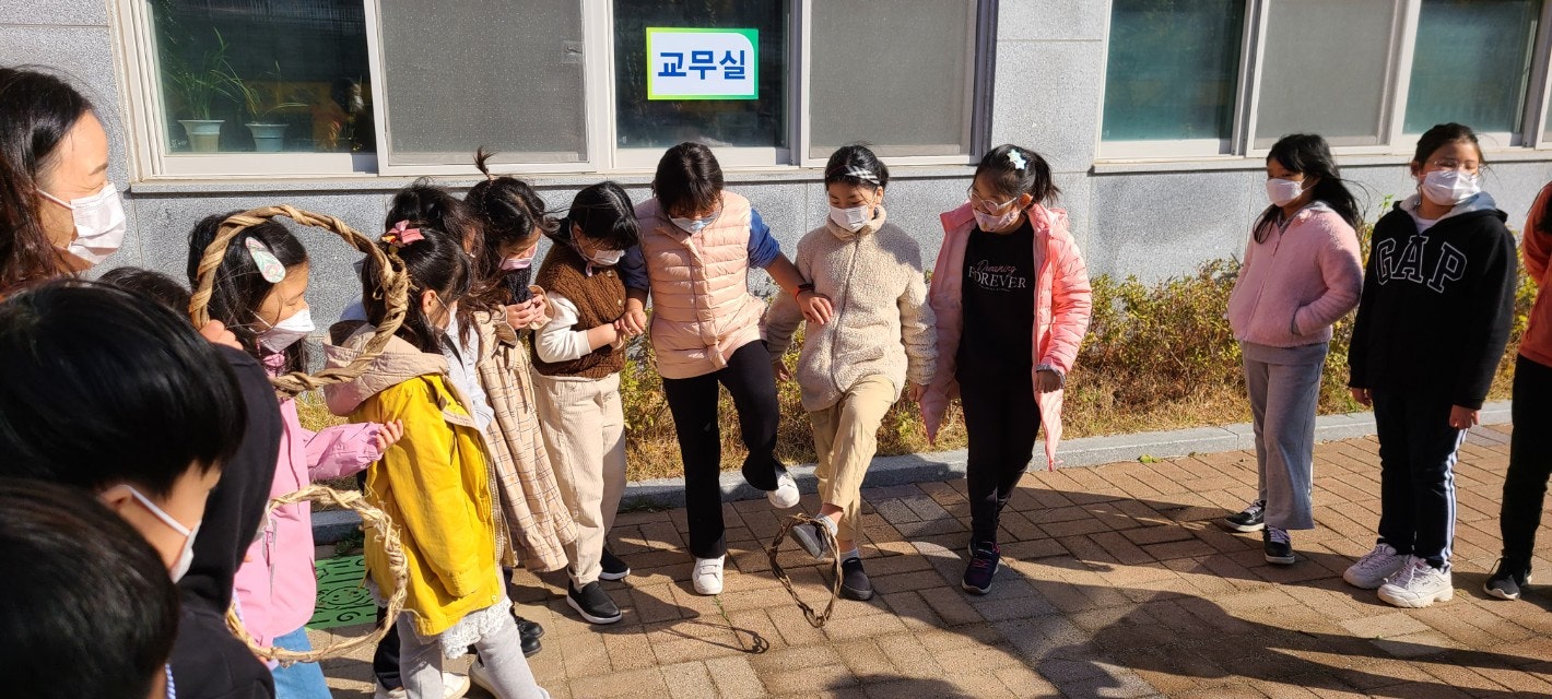 5) 식물줄기로 만든 전통놀이->손잡고 발로 주고받기, 몸 통과하기