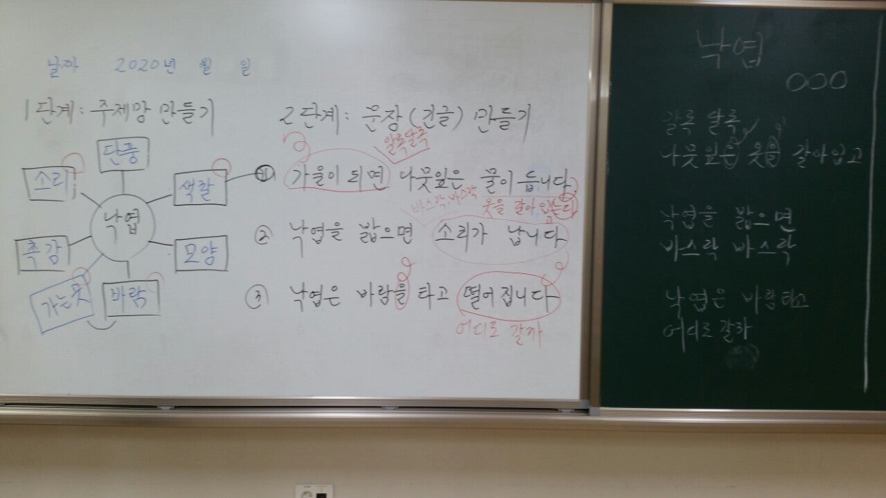 - 긴 문장 만들기: 2단계 동시 쓰기 지도는 1단계의 주제망을 보고 긴 문장으로 표현해 보는 단계입니다. 학생들이 자신의 경험과 관계된 낱말을 넣어 긴 글을 적는 법을 공부하다 보면 자연스럽게 흉내 내는 말을 넣어서 간단한 문장을 만드는 과정을 익히게 됩니다.