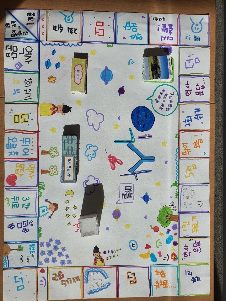 - 학생들이 배운, 알고 있는 지식을 활용하여 보드게임을 만들었습니다. 양식은 교과서 안의 부루마블을 참고하였습니다. 모둠별 활동으로 학 모둠별 다른 모양이 나오고 다양한 문제가 만들어졌습니다.