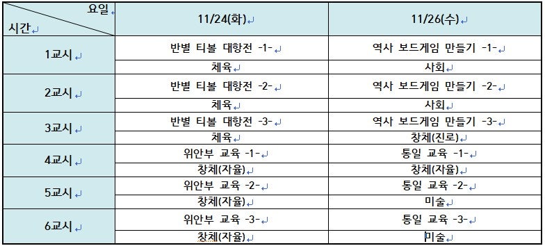 - 2학기 체육 수업에 배운 티볼 규칙 및 방법으로 반별 티볼리그전을 진행했습니다. 리그전으로 하기엔 시간이 부족하여 토너먼트식으로 이틀간 진행했습니다.