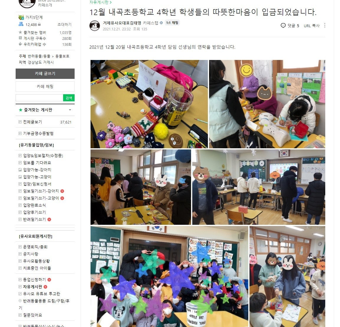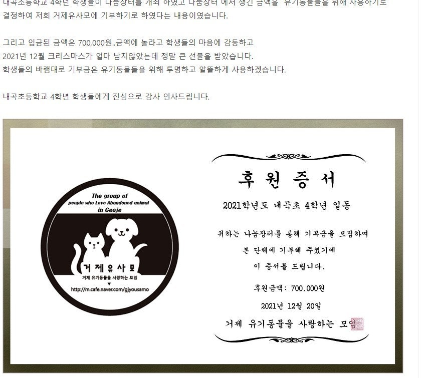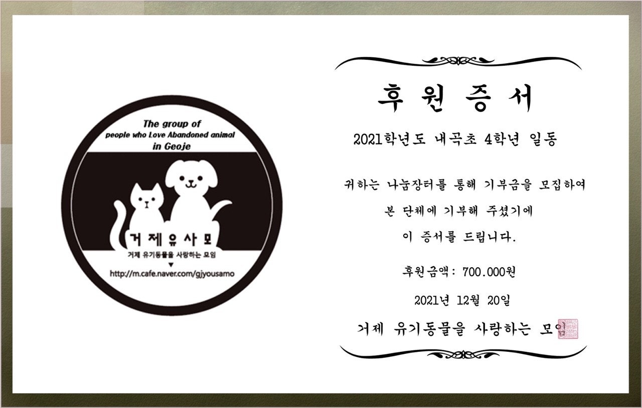 - 기부금 사용처는 학급자치회의[스타터]를 하여 의논하였고, 세이브더칠드런, 유니세프, 독거노인 돕기, 유기동물 보호소 등 중에서 거제시 유기동물 보호소인 [유사모]에 기부하기로 결정하였습니다.