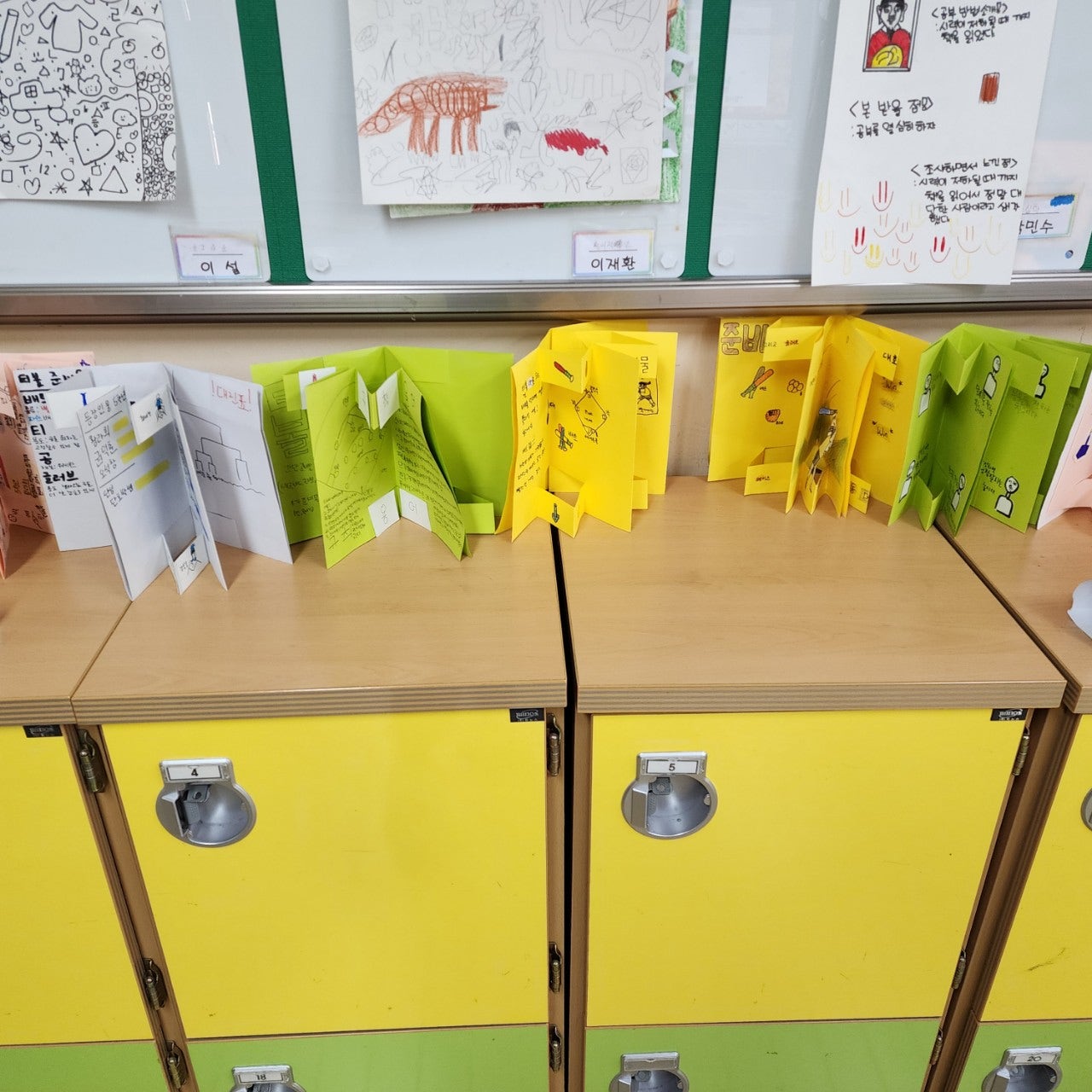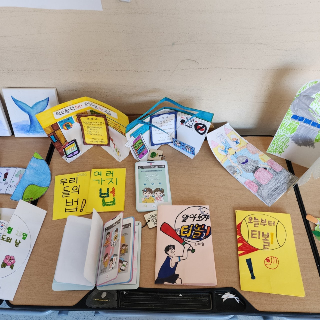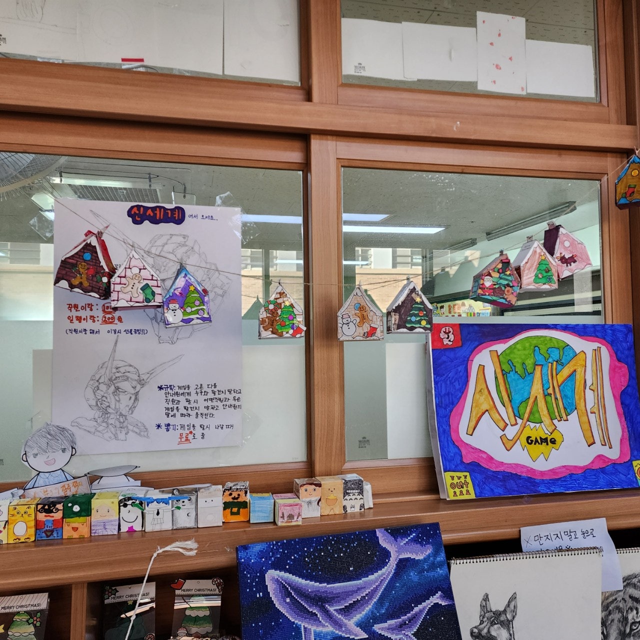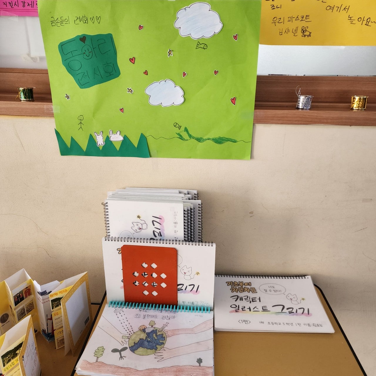 5학년 동아리 활동이었던 일러스트 동아리 활동 결과물을 전시회로 진행하고 서로의 결과물을 나누는 시간을 가졌습니다.