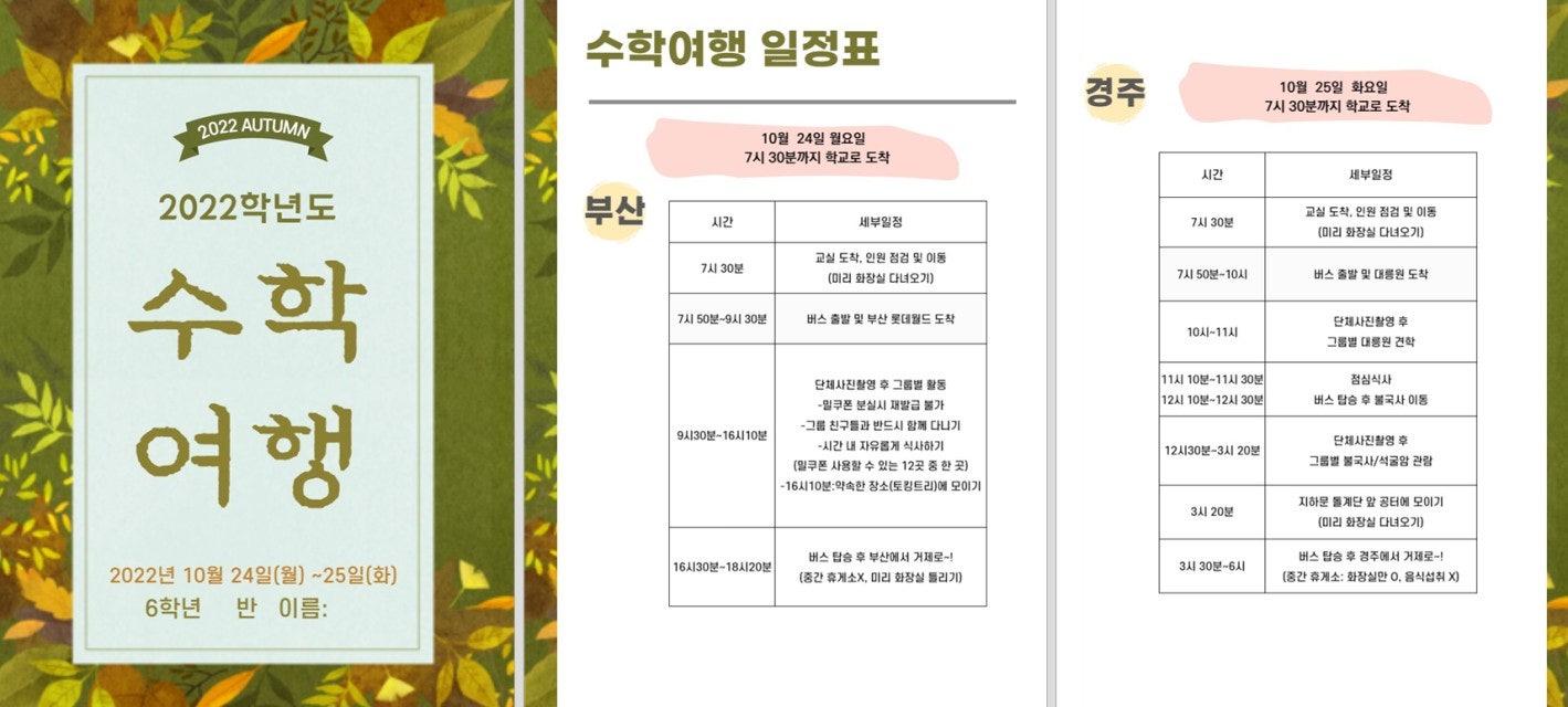 1) 수학여행 (1일차: 부산 롯데월드 / 2일차: 경주 대릉원, 불국사)