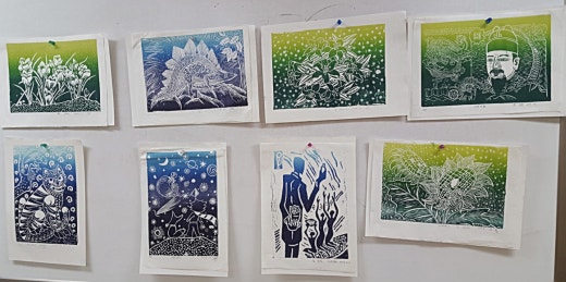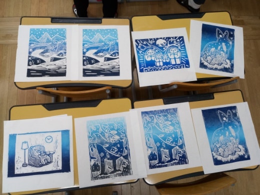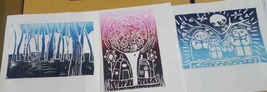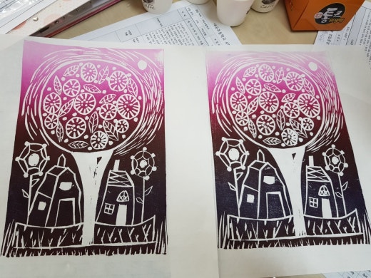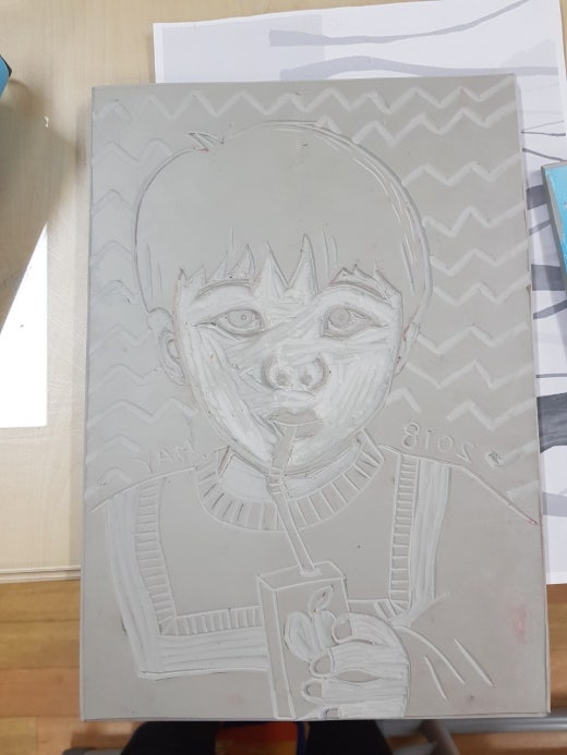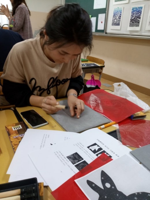 *준비물; 리놀륨판, 잉크, 조각칼, 바렌, 롤러, 빨강색 먹지, 신문지, 바니쉬, 수건, 유리판 , 이합지, 등