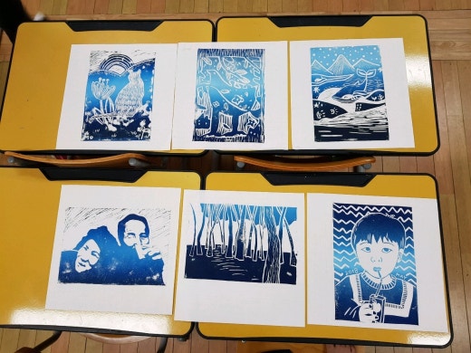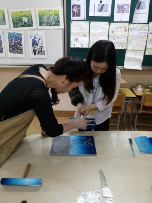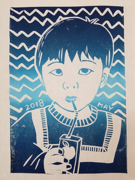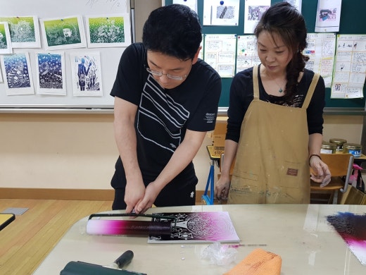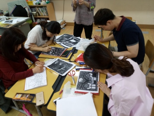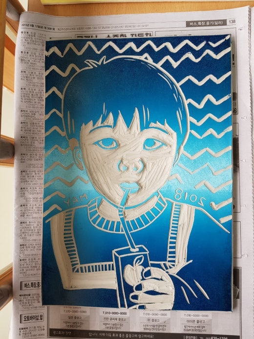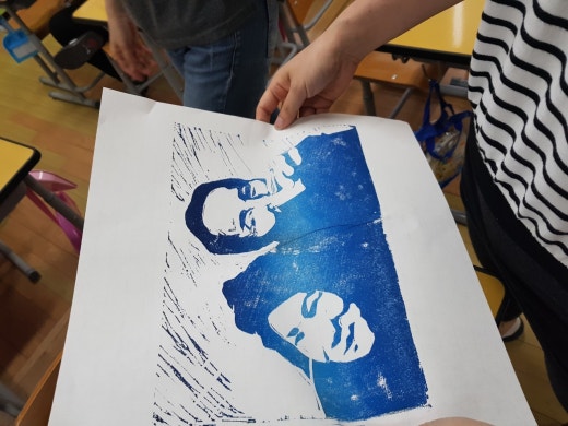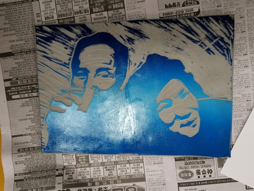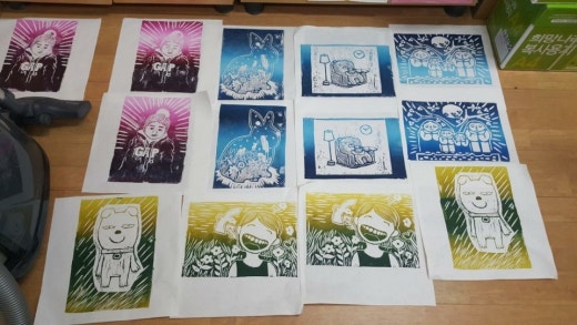 -신문지 깔고 화선지(매끄러운 부분이 위로)에 엎기(리놀륨판 집을때 손자국 나지 않게)