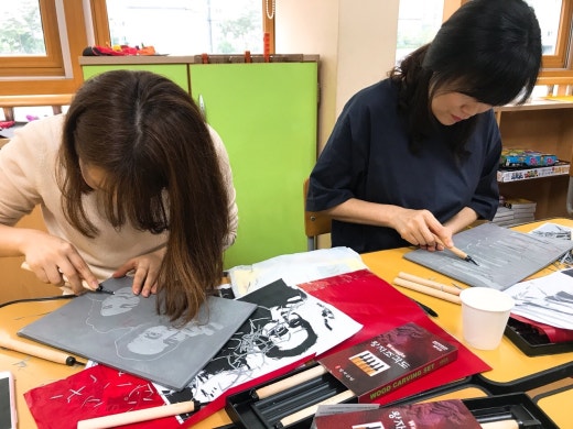 2. 조각: 조각칼날이 바깥쪽을 향하게, 조각칼 날의 특성 살려서. /하얗게 나오길 원하면 조금 깊이 파기