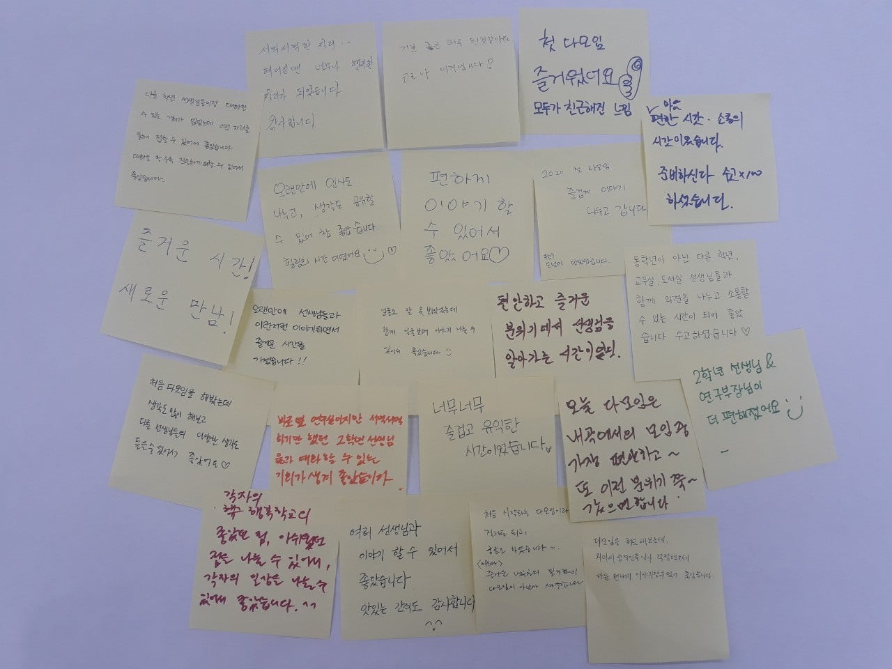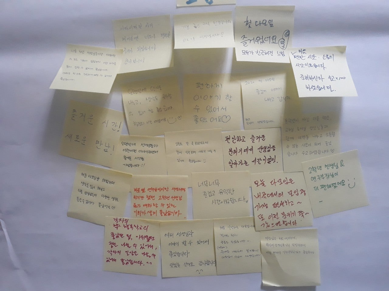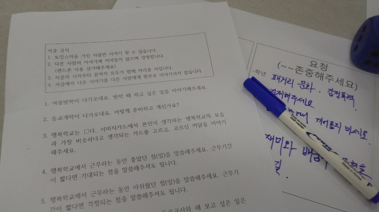 2020년 첫 다모임 5월 20일 14시 30분 1팀 : 1,6학년 2팀 : 2,4학년 그룹 5월 27일 14시 30분 3팀 : 3,5학년 그룹 2020년 첫 다모임이 코로나19의 영향으로 3개의 소그룹으로 나누어 진행되었습니다. 1,6학년 그룹을 맡아주신 최준혁선생님의 유쾌한 진행, 3,5학년 그룹을 맡아주신 전영숙선생님의 따뜻한 진행, 첫 모임이라 미숙한 저의 진행을 지지해주신 2,4학년 선생님들 덕에 첫 모임이 잘 마무리 된 것 같습니다. 첫모임에서는 각 학년의 의견을 받아들여 행복학교와 다모임의 의미에 대해 알아보았습니다. 행복학교를 어떻게 생각하는지, 좋았던 점과 아쉬웠던 점, 앞으로의 기대를 신뢰서클의 형식을 빌어 이야기 나누어보고, 건강한 공동체와 건강하지 않은 공동체에 대한 느낌을 나누면서 다모임 구성원에게 바라는 존중의 약속도 해보았습니다. 행복학교가 하는 일 보다는 왜 행복학교 형식의 혁신학교가 생겨났는지, 앞으로 나아가야 할 방향은 무엇인지에 대해서도 이야기할 시간이 있으리라 생각됩니다. 안전한 공간, 존중하는 공동체 속에서 좀 더 다양한 이야기가 오고 가기를 기대해 봅니다.