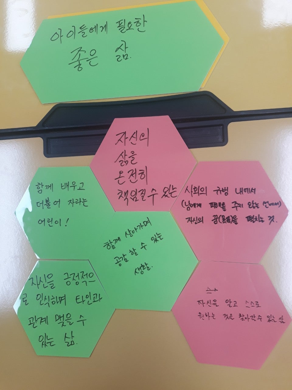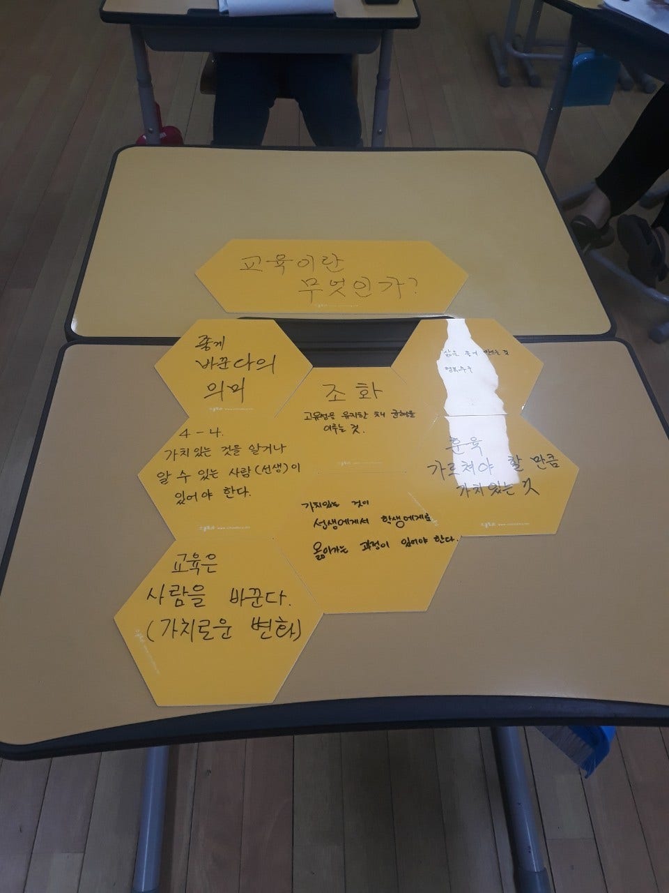 주제 1 : 교육이란 무엇인가를 읽고 읽은 자료 중 인상깊은 부분 나누기 -교육은 조화라고 생각한다. 교사의 입장이나 학생의 입장에 치우치지 않고 균형을 찾는 것 -삶을 좋게 만드는 것, 행복추구의 의미 →학원을 가서 학업성적이 좋은 아이들이라고 행복하진 않고 오히려 학업에 관심이 적은 친구들이 더 잘 적응하고 행복해 보이기도 한다. -가치있는 것이 선생에서 학생에게로 옮겨가는 과정이 있어야 한다. -가치있는 것을 알거나 알 수 있는 사람(선생)이 있어야 한다. -교사의 역할에 대해 생각하게 되었다. 교사로서의 정체성이 더욱 고민되는 시기이다. 내가 학생들을 변화시킬 수 있는 사람이라는 생각 -가르쳐야할 만큼 가치있는 것이 무엇인가? 내용만큼이나 사회생활을 기초를 다질 수 있는 훈육을 중요한 교육의 분야로 반영하는 것도 고려해야 한다. 주제2 : 고민점 - 좋게 바꾼다의 의미는 무엇인가 고민점과 연계하여 '아이들에게 좋은 삶이 무엇인지 이야기 나누기" 사람마다 다르며 교육의 여부에 따라 다르다. 아프리카 학생들이 더 행복할 수 있다. 자신이 편한것은 개인의 행복도가 높더라도 모두에게 좋은 것은 아니다. -자신을 알고 스스로 원하는 것을 찾아갈 수 있는 삶 : 자신을 알고 스스로 원하는 것을 찾아갈 수 있는 삶, 기본적인 것만 습득하면 진짜 하고 싶은 삶을 찾아가는 것 -사회의 규범 내에서 남에게 피해를 주지 않는 선에서 자신의 꿈(목표)를 펼치는 것 -자신을 긍적적으로 인식하며 타인과 관계를 맺을 수 있는 삶 - 함께 살아가며 공감할 수 있는 생활 - 함께 배우고 더불어 자라는 어린이 - 자신의 삶을 온전히 책임질 수 있는 자주적인 삶, 교사수준 교육과정을 짠다면 자기주도적인 삶을 살아갈 수 있도록 고민하여 반영해보고 싶다.