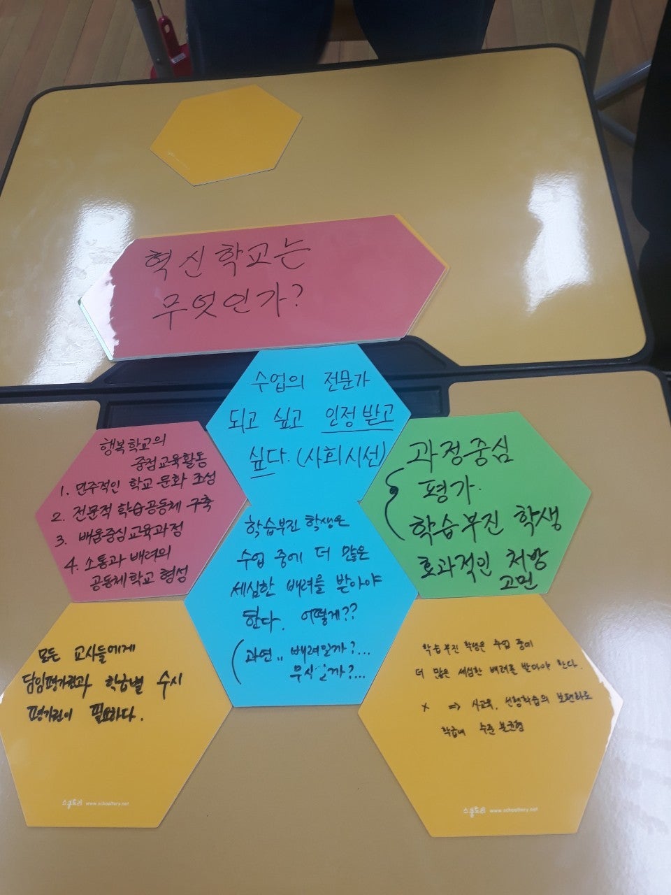 주제3 : 혁신학교는 무엇인가를 읽고 인상깊은 부분 나누기 - 학습부진 학생은 수업중에 더 많은 세심한 배려를 받아야 한다는 부분에 대한 의문 : 사교육, 선행학습의 보편화로 학급의 수준이 불균형 되고 지나친 부진학생 양성이 되는 것은 아닌지 - 학습부진 학생은 수업 중 더 많은 배려를 받아야 한다. 어떻게 배려할 것인가? 배려라고 학급에서 이루어지는 것이 무시는 아닐까? : 부진학생의 생각을 묻고 학급에 적응하도록 돕는 것에 대한 의견, 모르는 것이 부끄러운 것이 아니며 다른 학생의 어려움을 비웃지 않는 학급문화 만들기의 필요성 - 모든 교사들에게 담임평가권과 학급별 수시 평가권이 필요하다는 것을 인정하고 평가에 대한 문화가 많이 바꾸고 있음을 느낀다. - 행복학교의 중점활동 4가지 민주적인 학교문화 조성, 전학공 구축, 배움중심교육과정, 소통배려공동체 학교 형성이 우리 학교에 잘 자리잡고 있다고 느낀다는 의견 - 수업의 전문가가 되고 싶고 인정받고 싶다. 의사와 많이 비교되는데 교사도 경험치 만큼 실력을 인정받는 사회적인 분위기가 되었으면 - 과정중심 평가와 학습부진학생 지도는 교사의 품이 가장 많이 필요한 부분이다. 학교의 환경이 이런것을 어렵게 하는지, 교사의 의지나 중요성에 대한 견해의 차이가 어렵게 만드는 것인지 고민해야 될 지점이 있다.