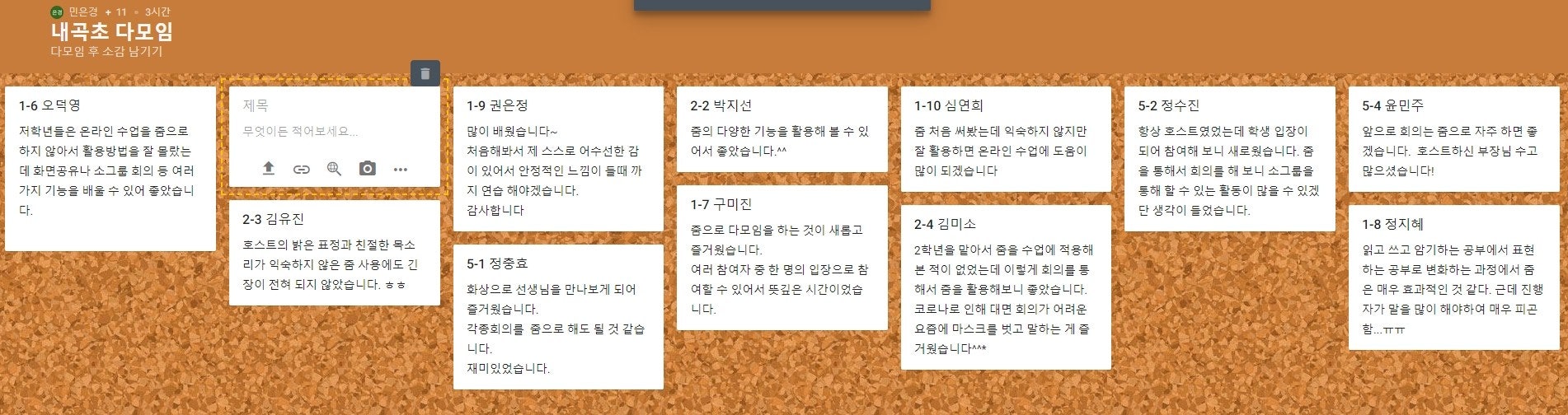 5학년 선생님들이 계셔서 줌 수업에 대한 실질적인 체험을 들을 수 있어서 더 좋았던 것 같습니다. 오전내내 화상수업하시고 화상회의 참석까지 해주신 5학년 선생님께 한 번 더 감사의 말씀 전합니다. 줌 수업을 해보신 선생님들께는 패들릿 후기에 있는 정현권 선생님 말씀처럼 학생들의 입장을 헤아려 보실 수 있는 시간도 되셨을 꺼라 생각됩니다.