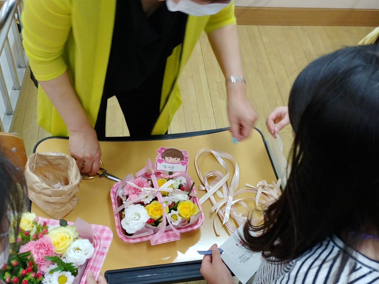 <학년특색교육-지역문화예술강사 초청 교육: 플라워테라피> 기간: 6월 29일~7월 16일 대상: 3학년 전 학생 내용: 감사의 마음을 담은 꽃도시락 만들기 몸과 마음을 치유하는 꽃의 놀라운 능력을 알고 계시나요? 코로나19로 인한 등교와 온라인수업 병행으로 지친 아이들에게 플라워테라피 수업을 마련하였습니다. 우리 지역에서 삐삐꽃방을 운영하는 김재록 플로리스트를 초청하였으며 각 반당 2시간의 수업이 진행되었습니다. 첫 시간은 하루 동안 감사했던 일이나 감사한 분께 카드 적기, 플로리스트라는 직업 소개와 꽃의 이름, 꽃꽂이할 때 주의사항 등을 배웠고, 두 번째 시간에는 감사하는 대상을 생각하며 꽃도시락(플로랄폼에 꽃을 꽂아 꾸미는 작품)을 꾸미는 활동을 하였습니다. “꽃꽂이가 어려울 줄 알았는데 생각보다 쉽고 재미있었다.” “예쁜 꽃을 장식하는 게 기분이 좋았고 다음에 또 하고 싶다.” “선생님도 친절하시고 가족들에게 줄 생각을 하니 기분이 좋았다.” 활동 후 소감 말하기에서 예쁜 결과물에 대한 뿌듯함과 꽃도시락을 가족에게 전달할 것을 생각하며 들떠 있는 아이들의 모습에서 행복함을 느낄 수 있었습니다. 꽃도시락을 받은 어머니들로부터 문자가 왔습니다. “서프라이즈 선물~ 너무 이쁘고 감동적입니다.” “받고 기분이 너무 좋았습니다.” “완성도가 너무 높아 깜짝 놀랐어요” “꽃을 보니 기분도 좋고 감사카드에 감동도 받았어요. 너무 행복한 선물이예요. 감사합니다.” 코로나19로 인해 지친 몸과 마음을 조금이라도 치유할 수 있는 시간이 되었습니다.~ 번역 중입니다...