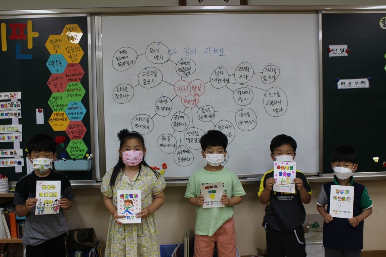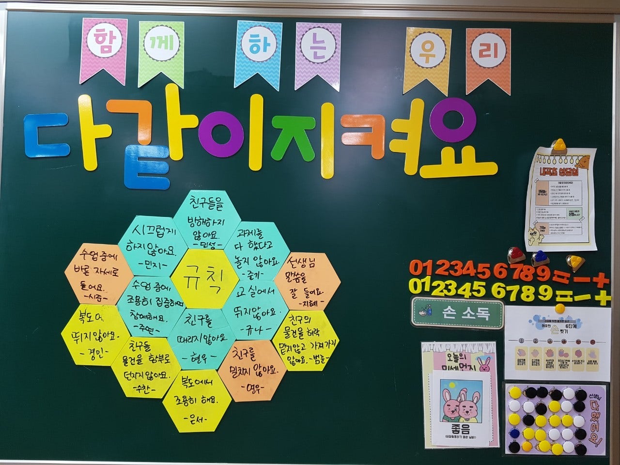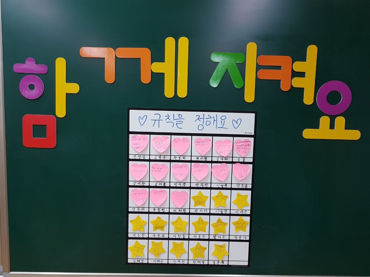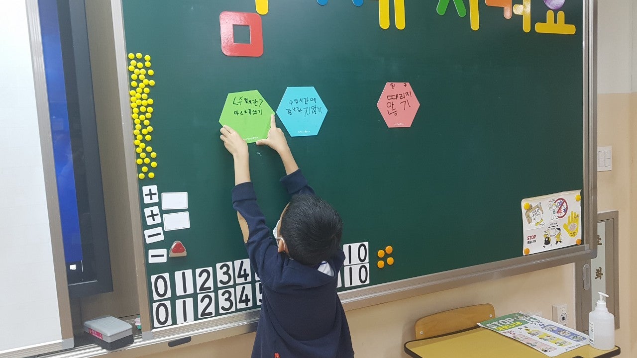 학교 생활이 처음인 1학년 학생들과 함께 학교에서 지켜야 할 것들은 무엇이 있는지 생각해보고 규칙을 정해보았습니다. 공통적으로 뛰지 않기, 친구에게 고운 말 쓰고 폭력 쓰지 않기, 조용히 생활하고 수업시간에 집중하기 등 여럿이 생활하는 공간에서 다른 사람을 생각하고 배려하자는 취지의 의견이 많았습니다. 또한 코로나19라는 특수성 아래에서 마스크를 잘 쓰기, 다른 사람 물건 함부로 만지지 않기 등도 나와 남을 배려하는 행동임을 이야기해보았습니다.