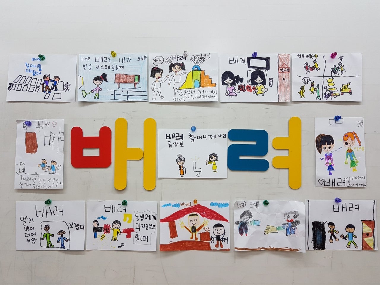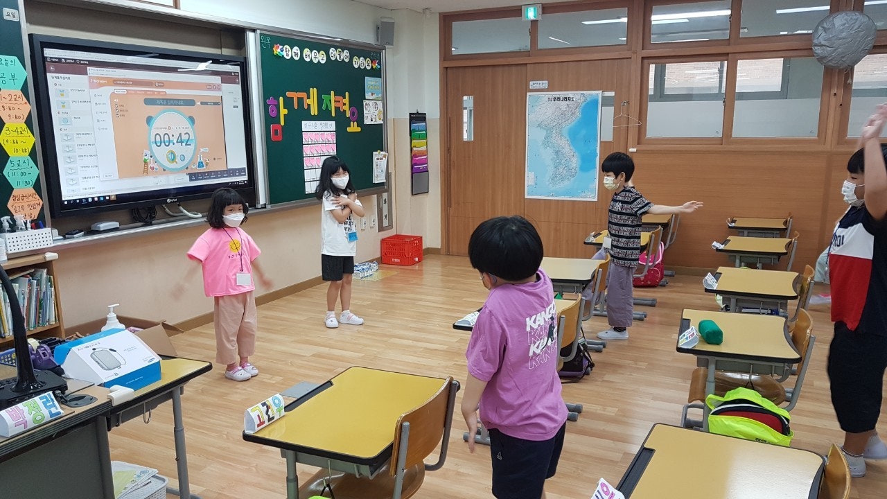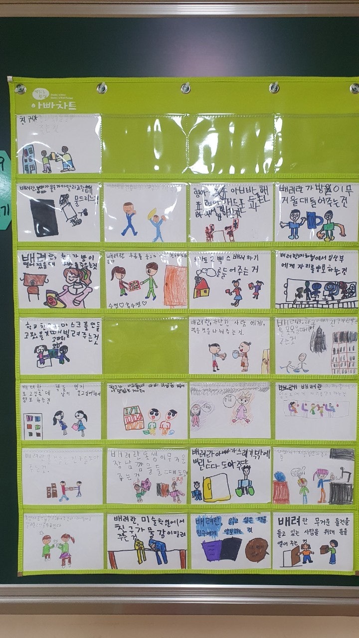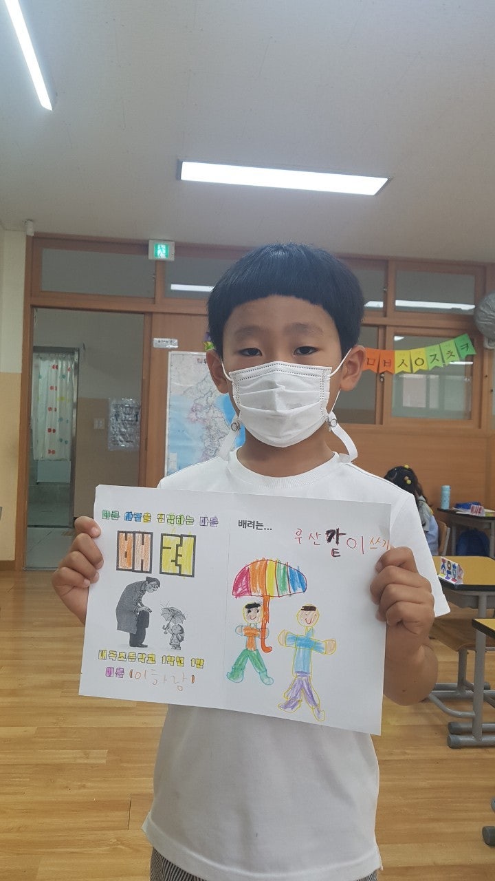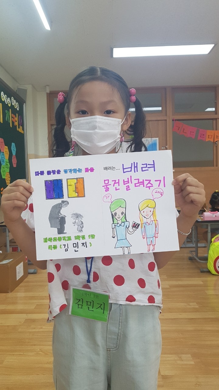 학교 생활이 처음인 1학년 학생들과 함께 학교에서 지켜야 할 것들은 무엇이 있는지 생각해보고 규칙을 정해보았습니다. 공통적으로 뛰지 않기, 친구에게 고운 말 쓰고 폭력 쓰지 않기, 조용히 생활하고 수업시간에 집중하기 등 여럿이 생활하는 공간에서 다른 사람을 생각하고 배려하자는 취지의 의견이 많았습니다. 또한 코로나19라는 특수성 아래에서 마스크를 잘 쓰기, 다른 사람 물건 함부로 만지지 않기 등도 나와 남을 배려하는 행동임을 이야기해보았습니다.