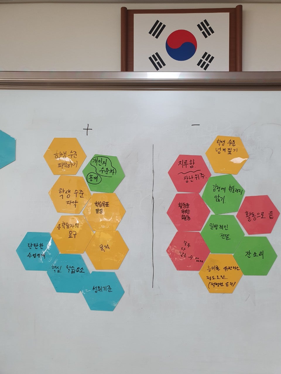- 허니컴보드를 활용해 키워드 중심으로 선생님들이 생각하는 지향, 지양해야 할 것에 관해 러닝 설계 단계(1~5단계)와 관련지어 서로 얘기 나누며 마무리 하였습니다. 또한 스파크 러닝 기법 카드를 활용해 각 단계에 접목시킬 것을 생각해보며 학습 경험 디자인을 해보았습니다.