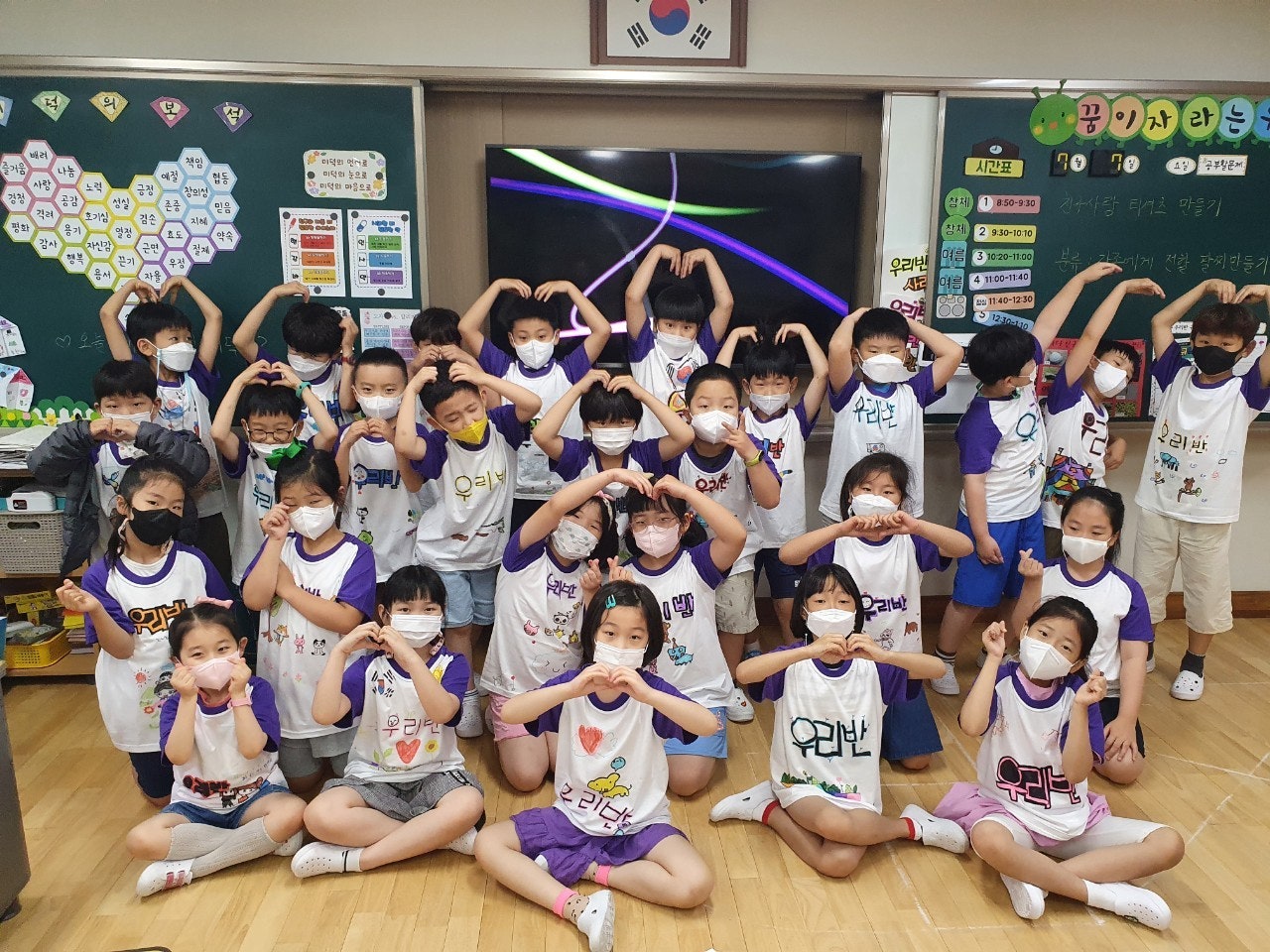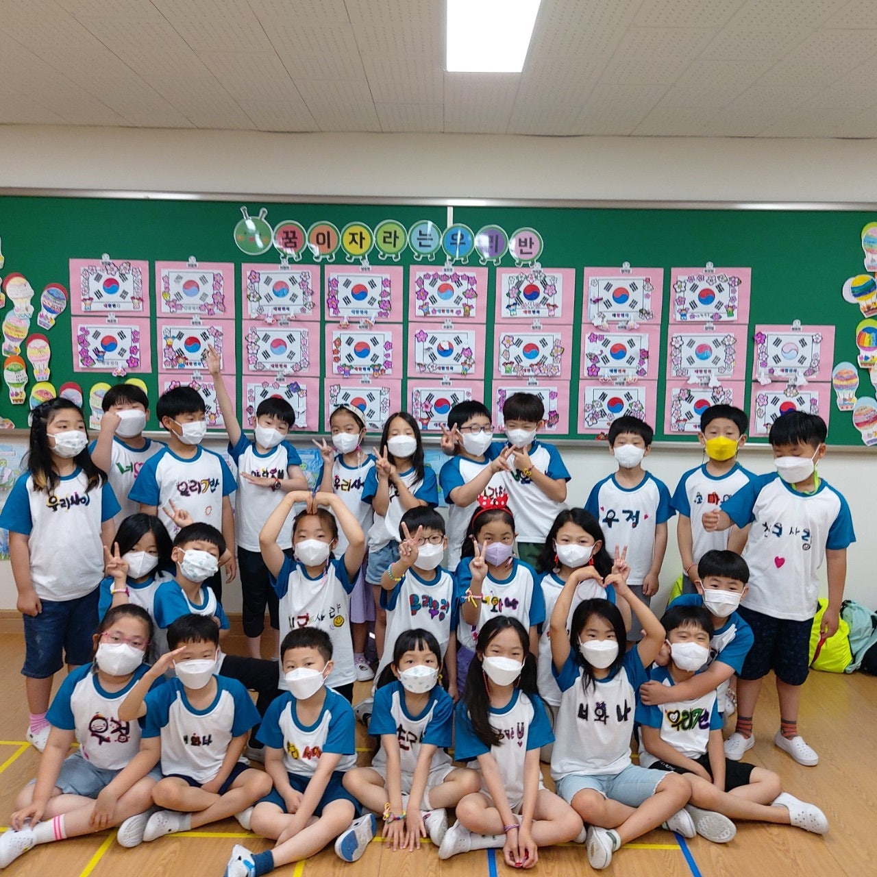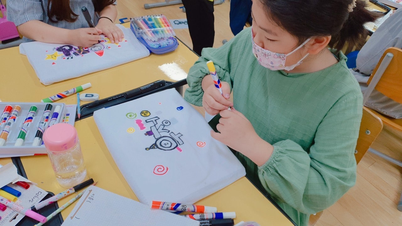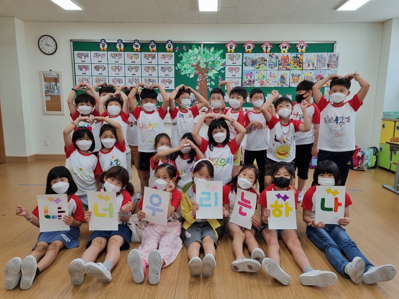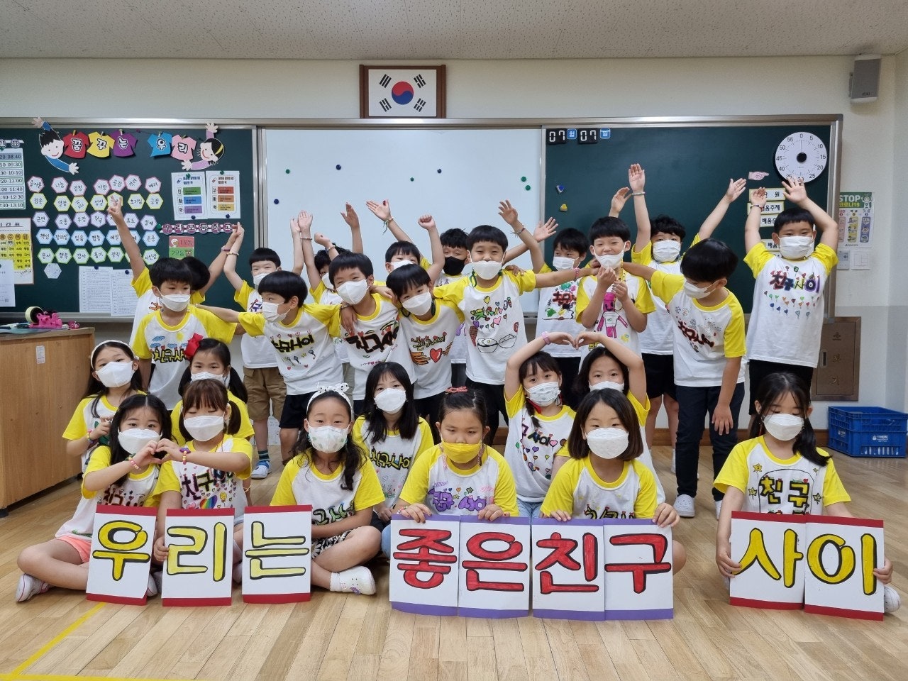 1) 친구 사랑 티셔츠 만들기 - 학급별로 친구 사랑을 주제로 학습지에 티셔츠 도안을 그려본 후 POP 수업 시간에 배운 글씨를 직접 써서 학급 티셔츠 만드는 활동을 하였습니다. 완성된 티셔츠를 입고 멋진 기념사진도 찍고, 정말 즐겁고 의미 있는 시간이었습니다.