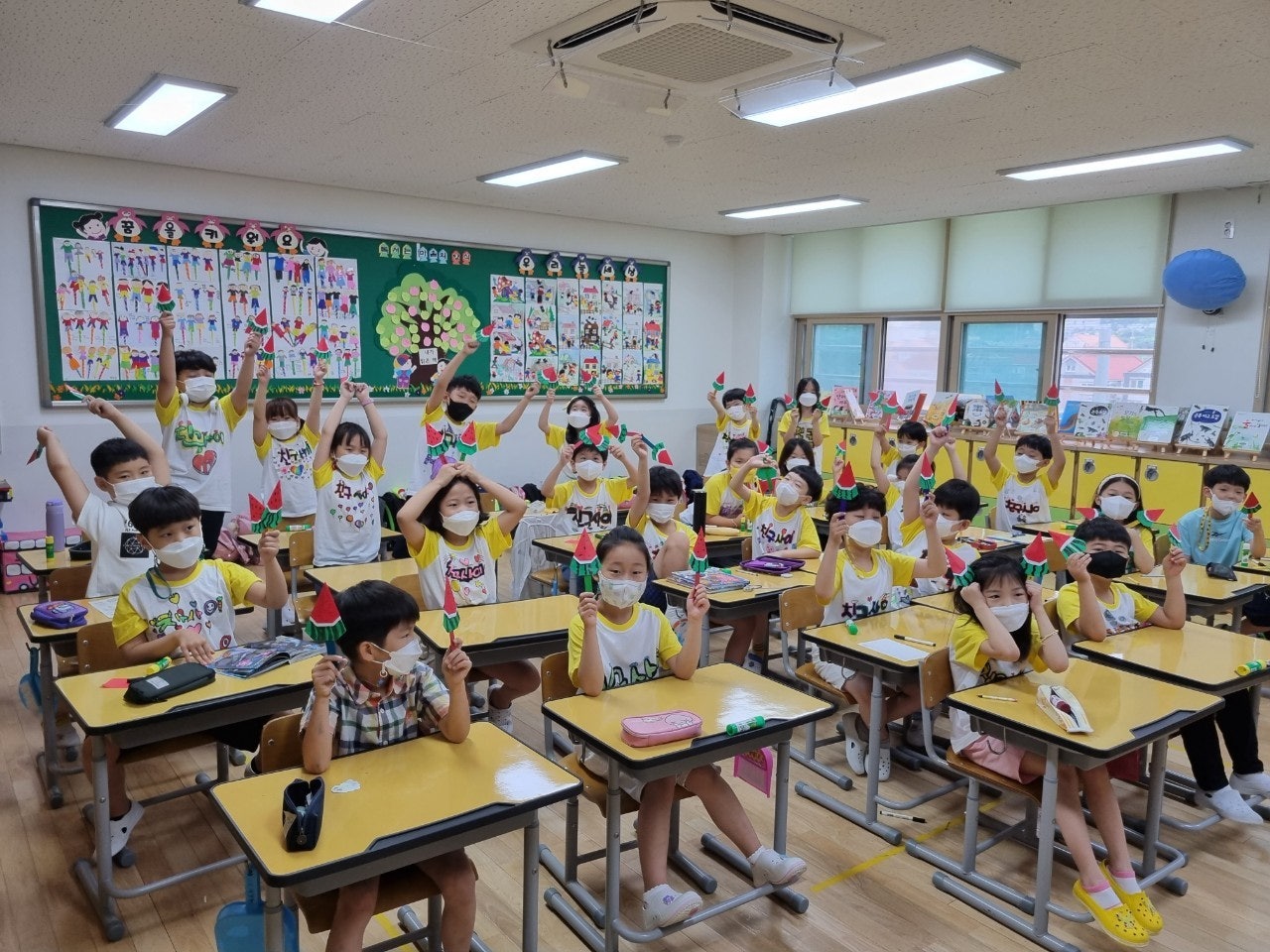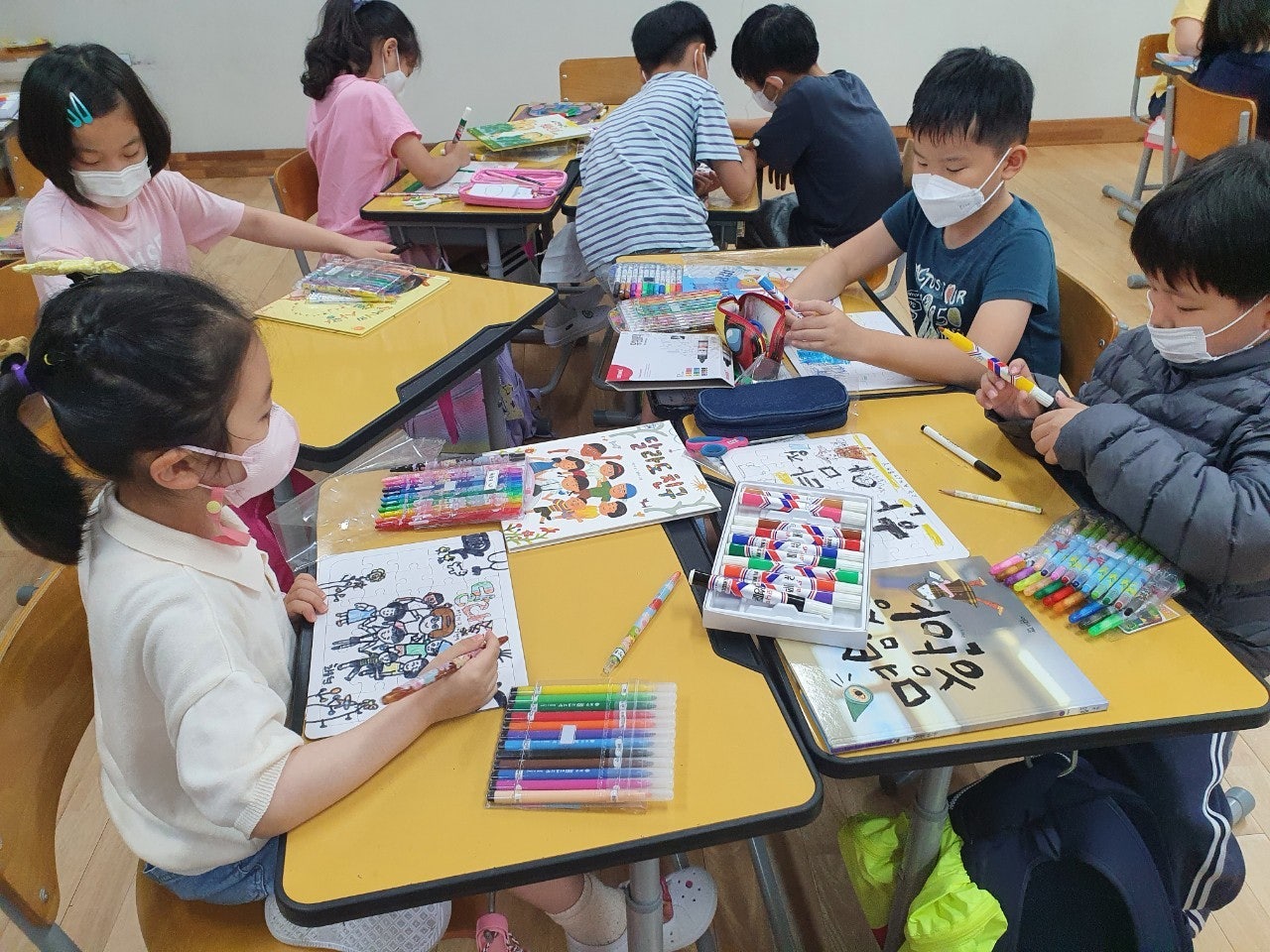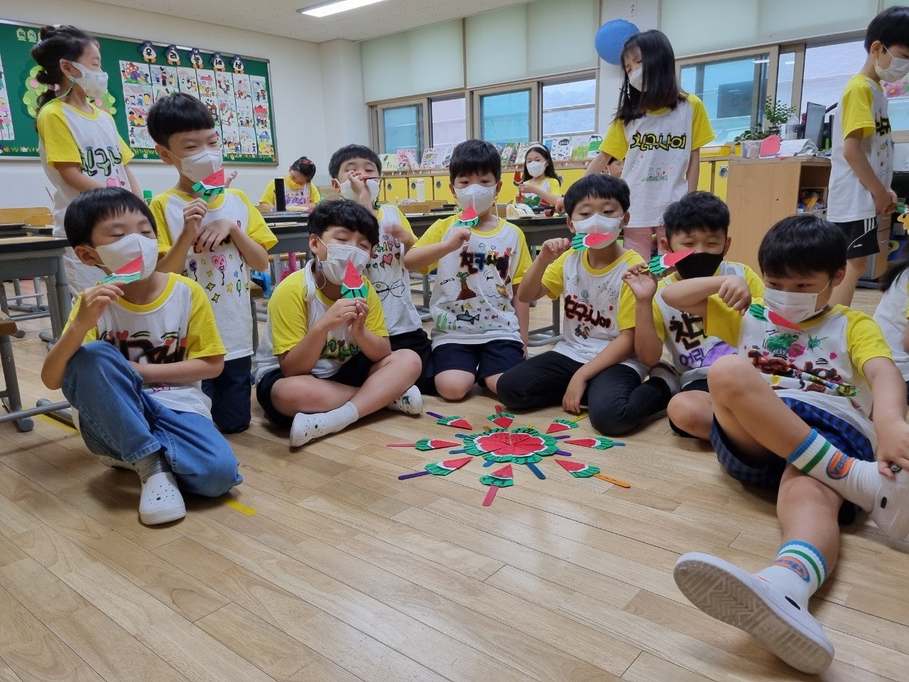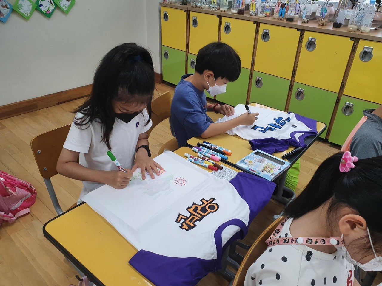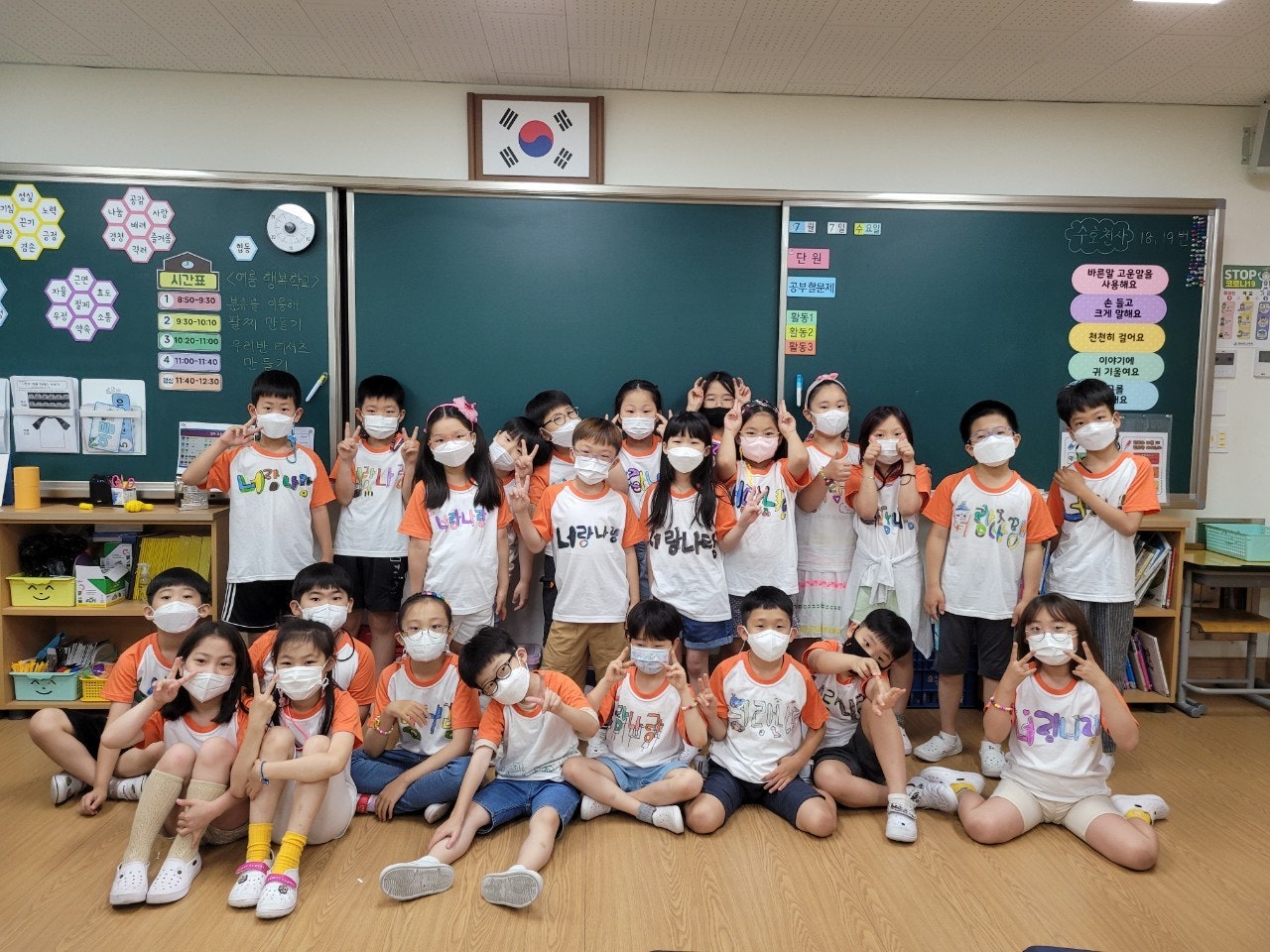 1) 친구 사랑 티셔츠 만들기 - 학급별로 친구 사랑을 주제로 학습지에 티셔츠 도안을 그려본 후 POP 수업 시간에 배운 글씨를 직접 써서 학급 티셔츠 만드는 활동을 하였습니다. 완성된 티셔츠를 입고 멋진 기념사진도 찍고, 정말 즐겁고 의미 있는 시간이었습니다.