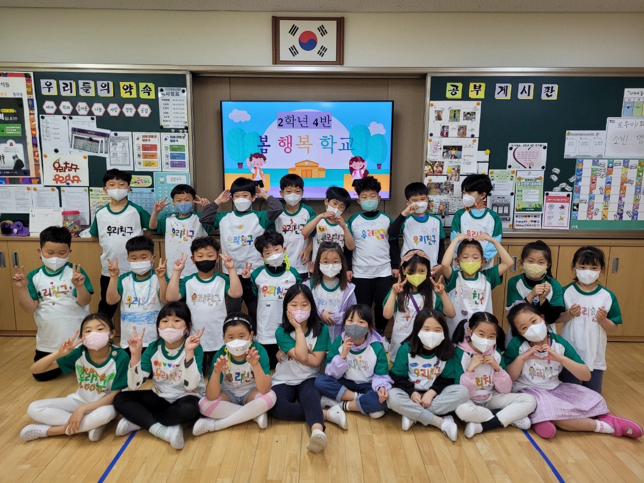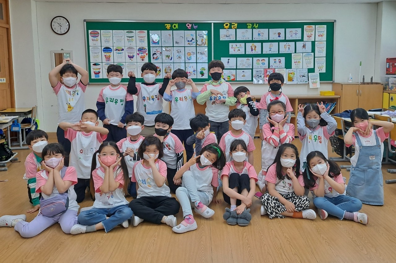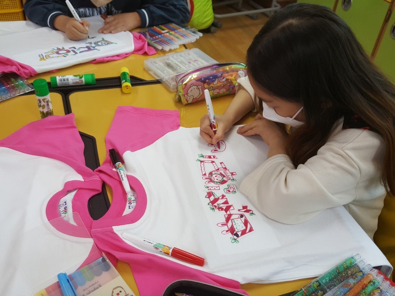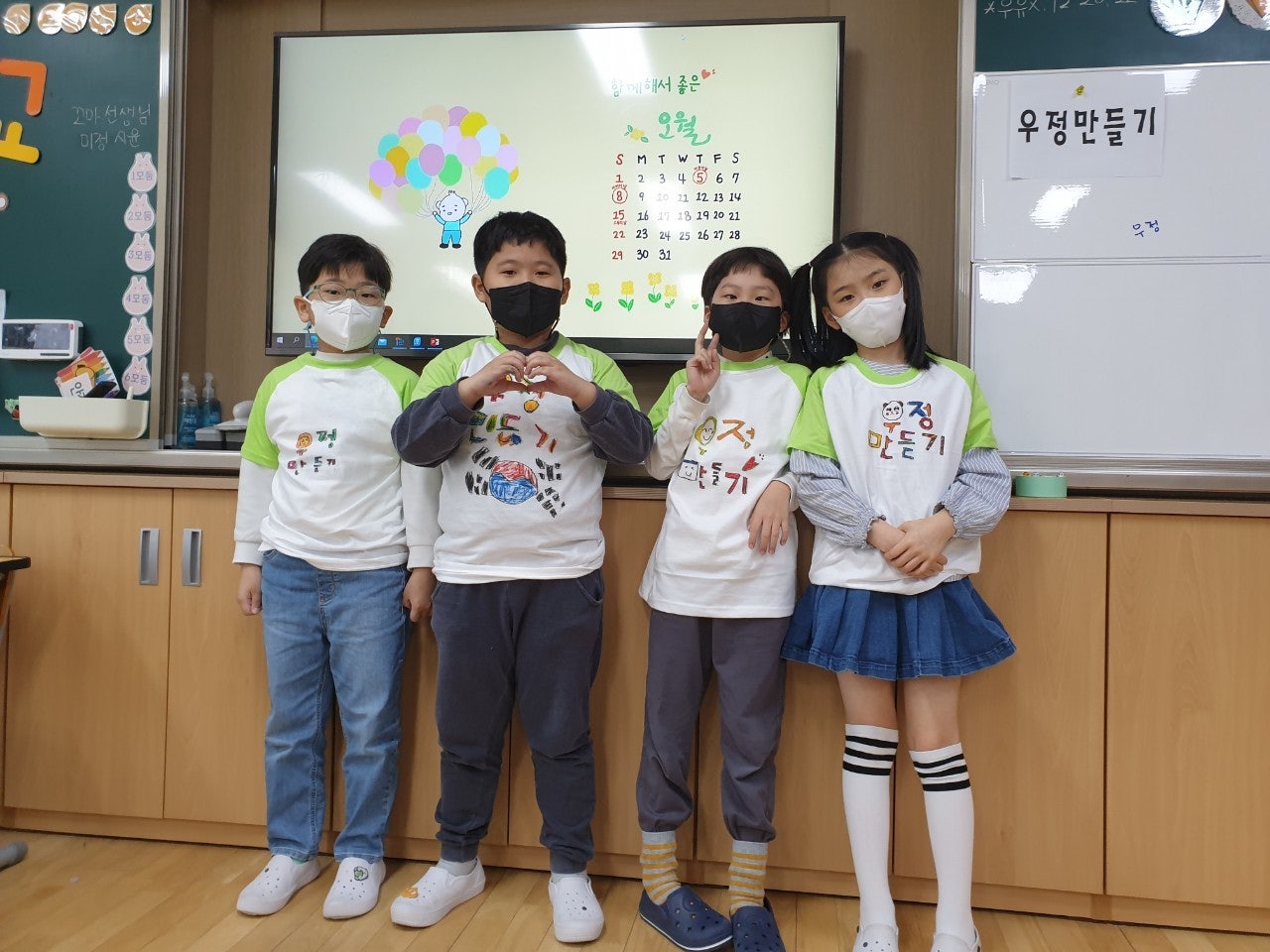 1) '친구 사랑' 학급 티셔츠 꾸미기 - 학급별로 친구 사랑을 주제로 POP 수업 시간에 배운 글씨를 직접 써서 학급 티셔츠 꾸미는 활동을 하였습니다. 완성된 티셔츠를 입고 멋진 기념사진도 찍고, 정말 즐겁고 의미 있는 시간이었습니다.