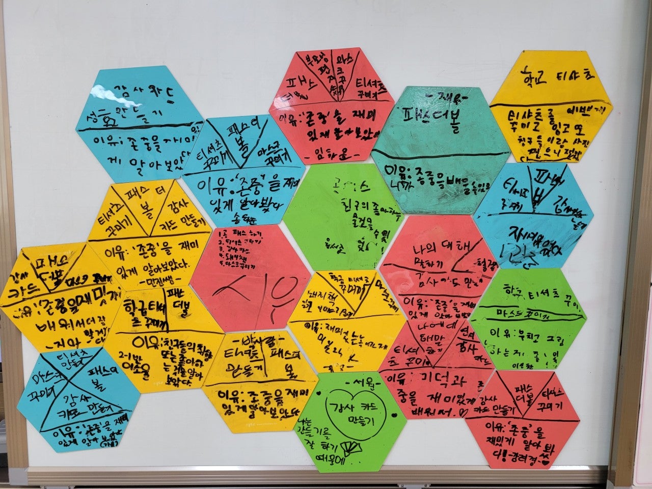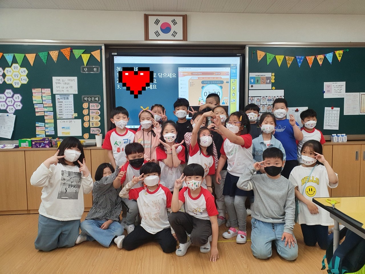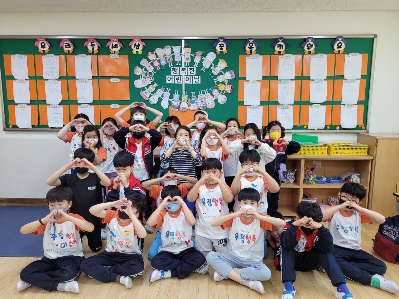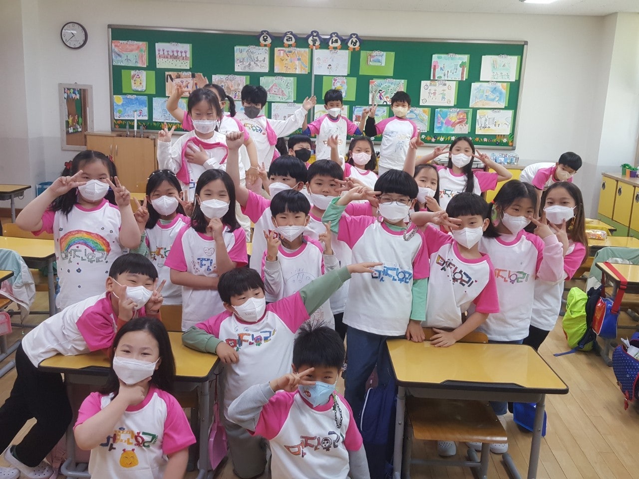 1) '친구 사랑' 학급 티셔츠 꾸미기 - 학급별로 친구 사랑을 주제로 POP 수업 시간에 배운 글씨를 직접 써서 학급 티셔츠 꾸미는 활동을 하였습니다. 완성된 티셔츠를 입고 멋진 기념사진도 찍고, 정말 즐겁고 의미 있는 시간이었습니다.