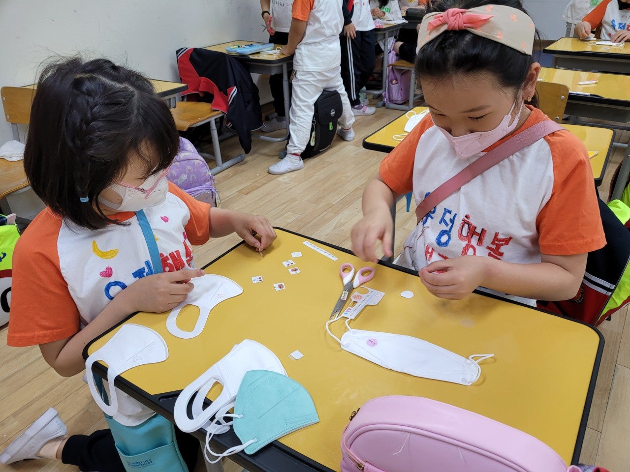 3) 스티커로 황사마스크 꾸미기(봄철 안전 교육) - 황사, 미세먼지로부터 우리 몸을 지키기 위한 여러 가지 방법을 알아보고, 스티커로 황사마스크를 꾸미는 활동을 하였습니다.