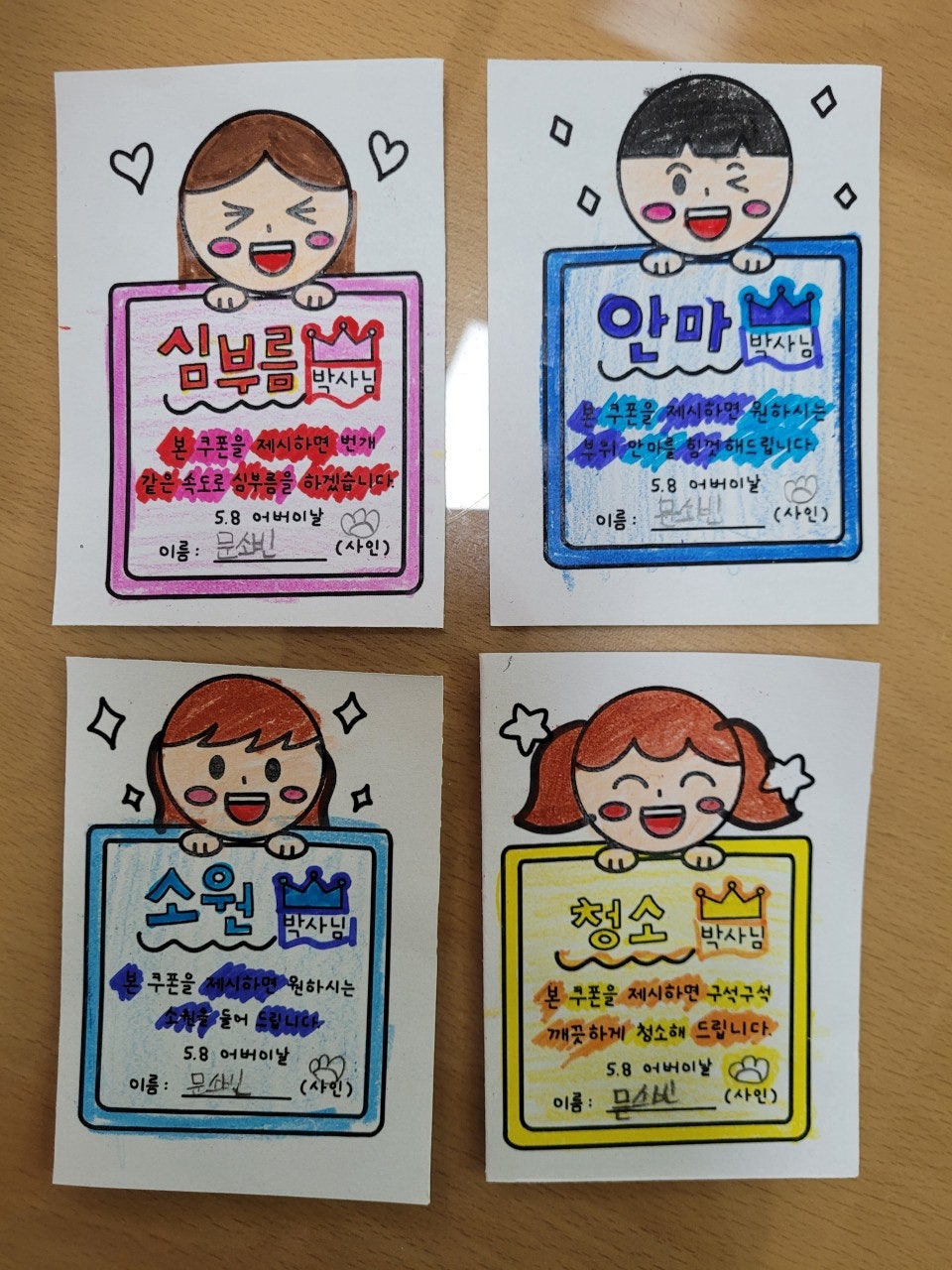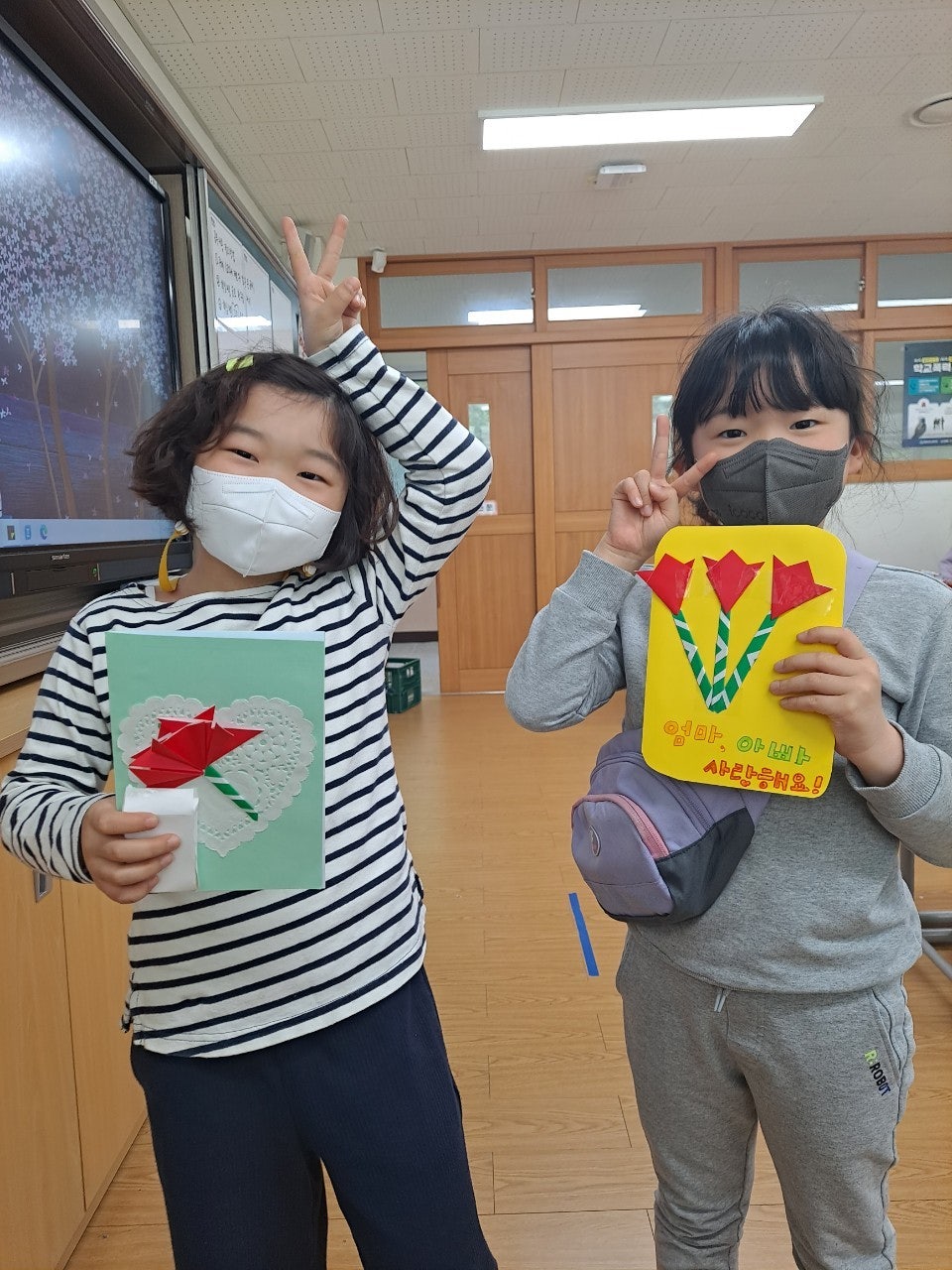 4) 그림책 놀이(<돼지책> 그림책 읽기, 카네이션 만들기, 부모님께 편지쓰기) - <돼지책> 그림책 읽고, 부모님의 감사함에 대해 생각해 보았습니다. 그리고 '어버이날'을 맞이하여 부모님께 전할 카네이션을 만들고 감사편지를 쓰는 시간을 가졌습니다. 완성된 감사카드와 쿠폰선물은 감사의 마음을 담아 부모님께 전달하였습니다.