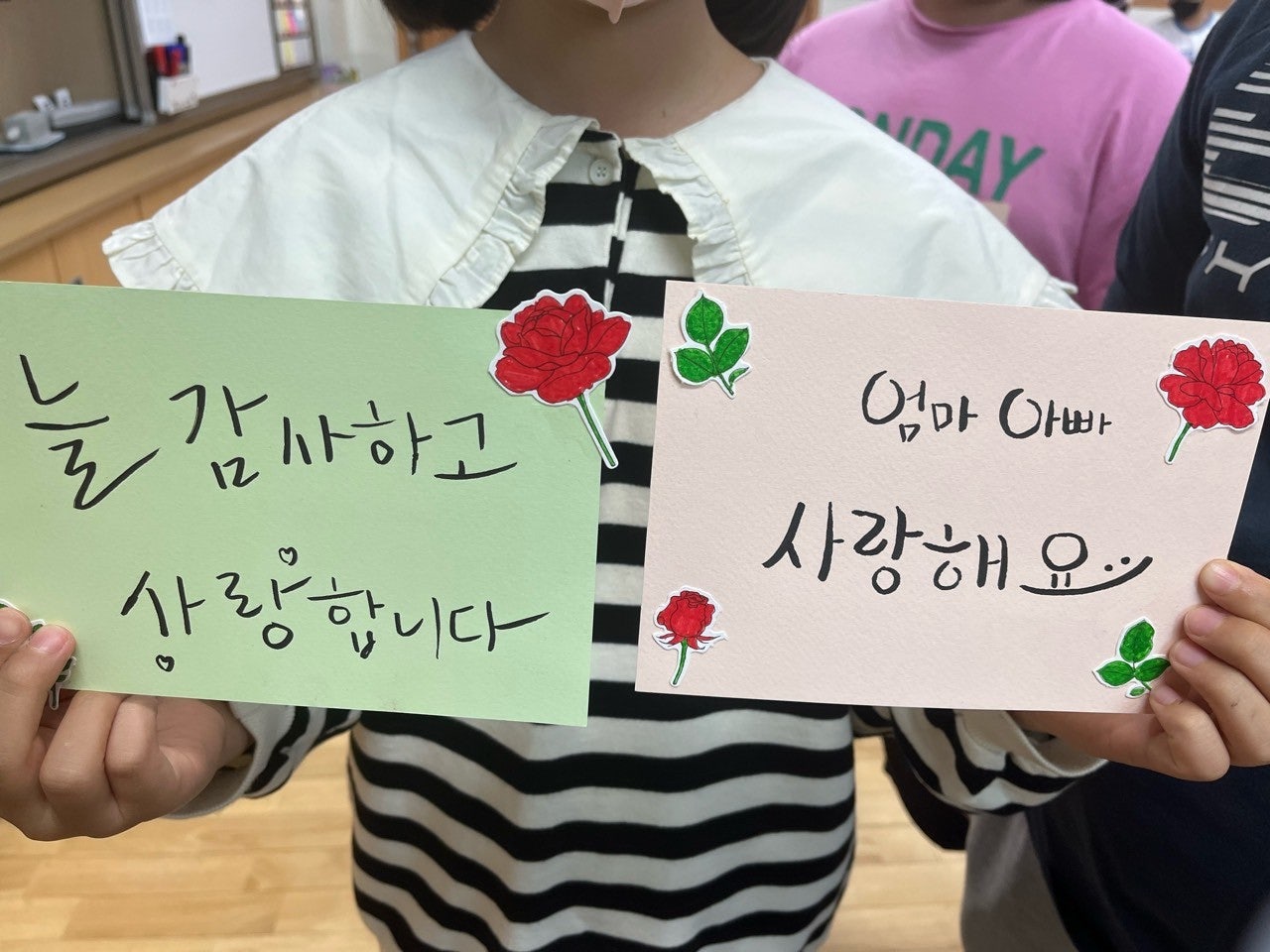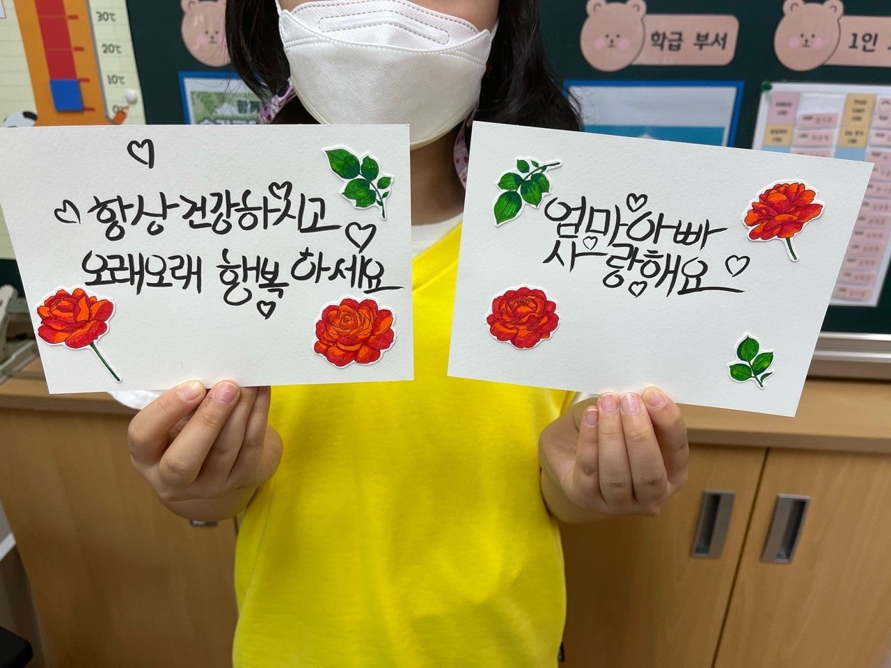 카네이션을 색칠하고, 강사 수업으로 배웠던 캘리그라피를 활용하여 카드를 만들었습니다.