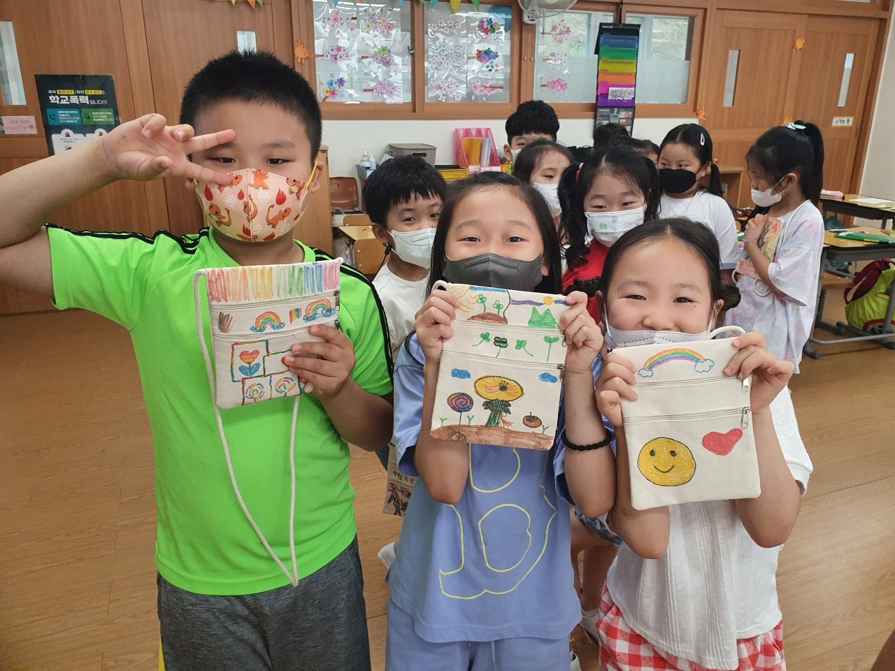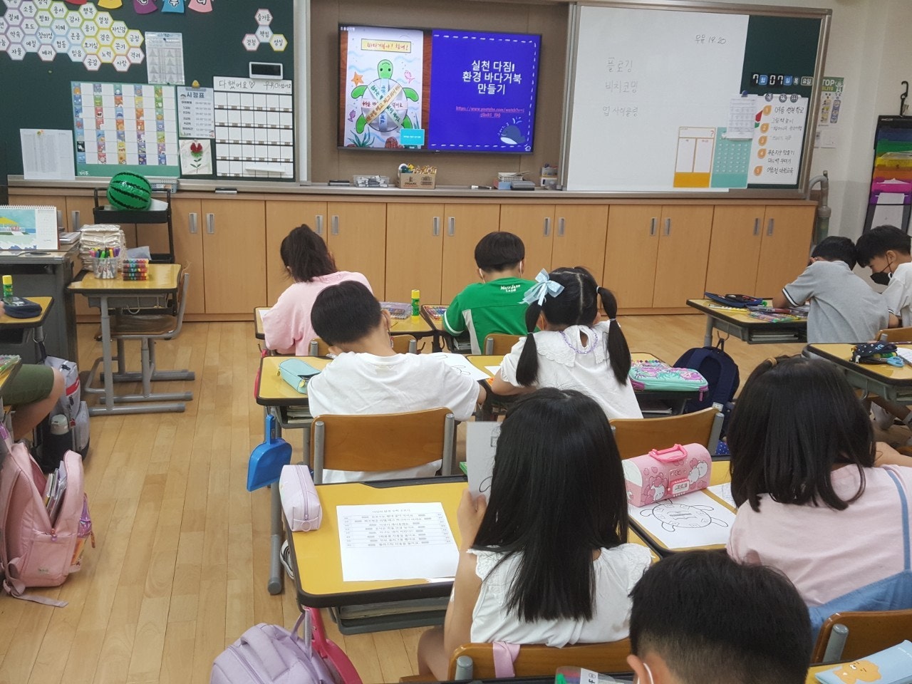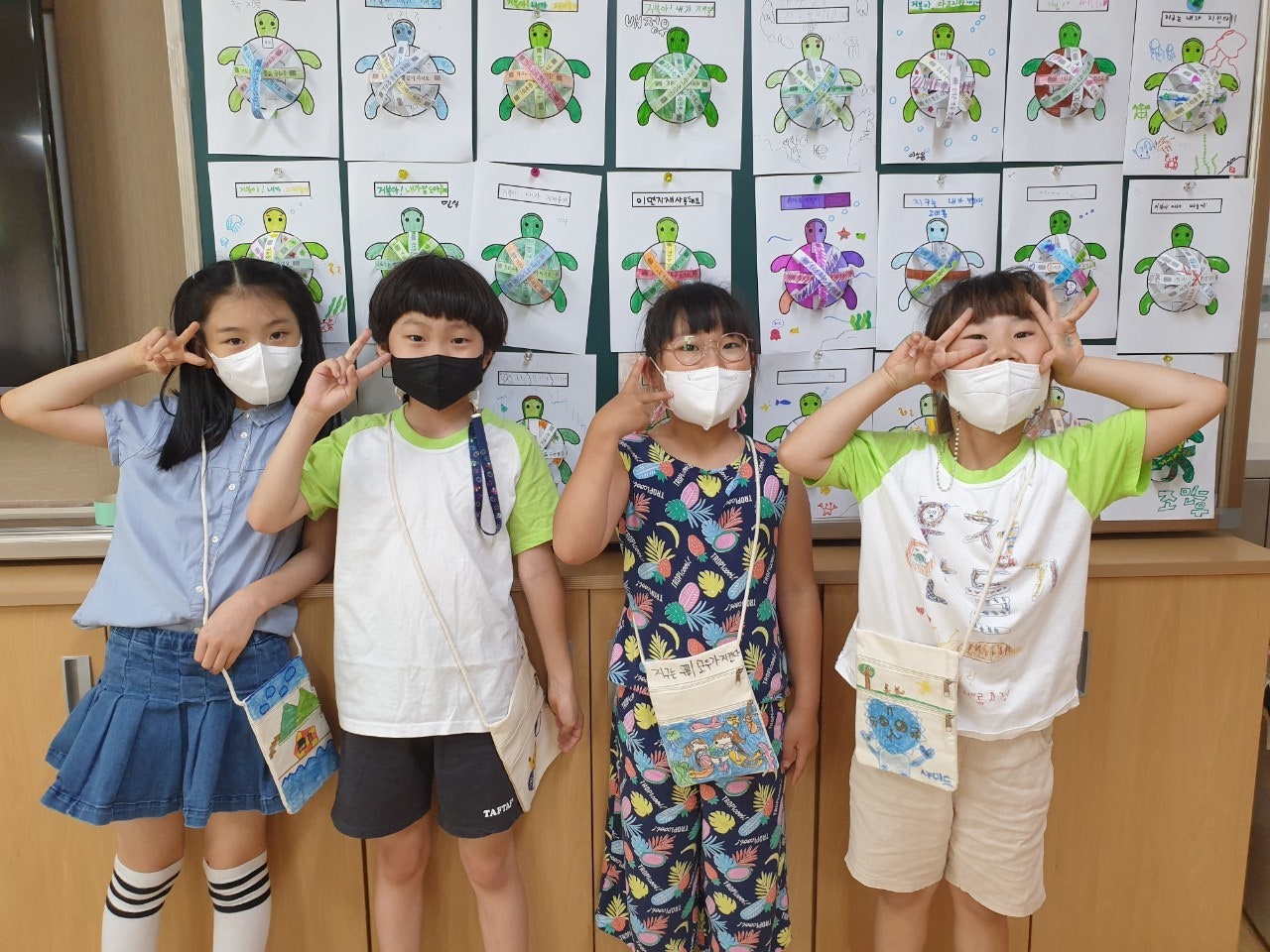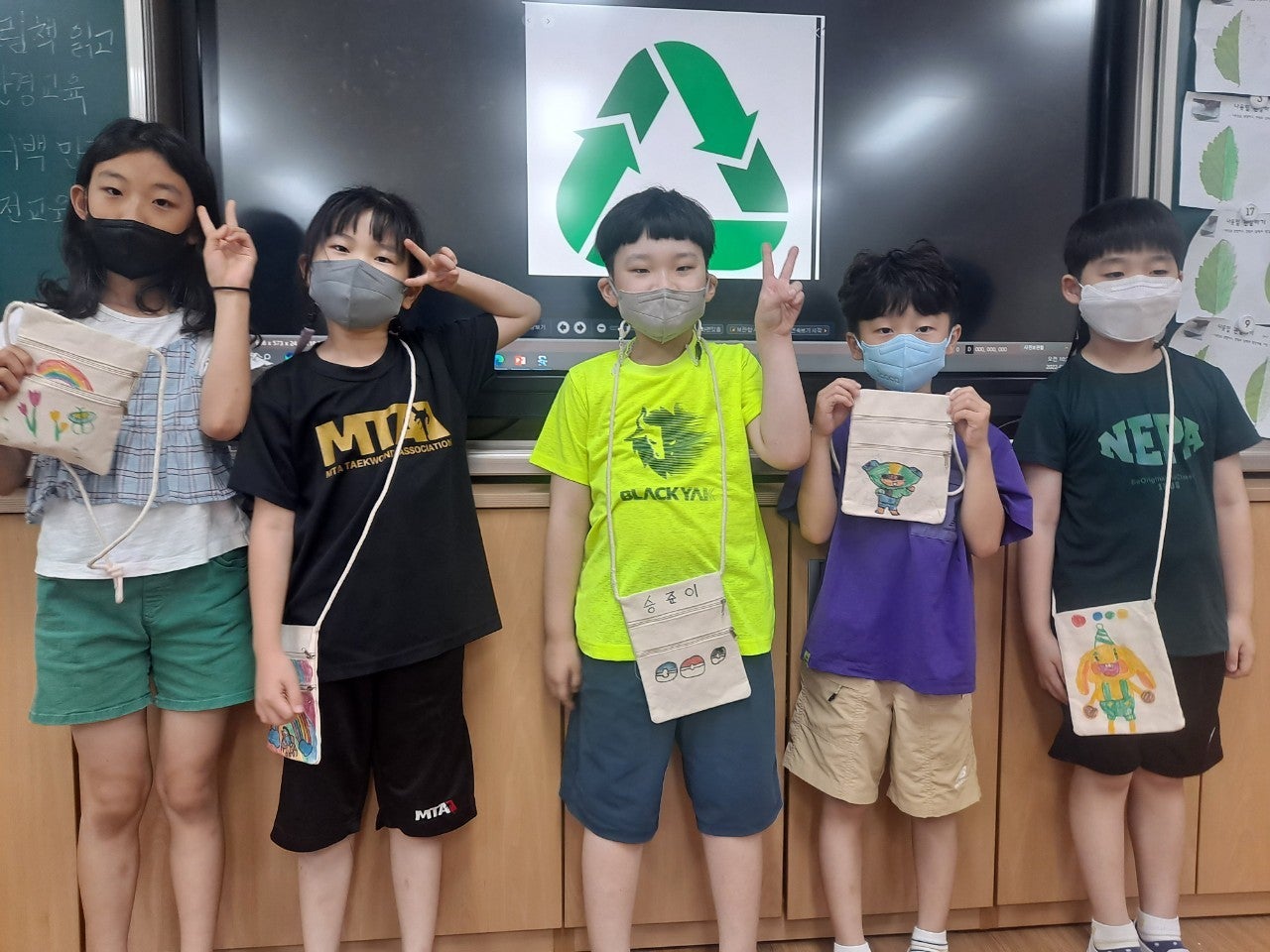 - 푸른 지구를 만들기 위해 나만의 미니백을 만들어 일회용품 사용을 줄이기 위한 다짐을 하였습니다. 학급마다 '친구 사랑', '환경 보호' 등 다양한 주제를 가지고 POP 수업 시간에 배운 글씨를 직접 쓰고 그림을 그려 나만의 미니백을 만들어 멋진 기념사진도 찍었습니다.