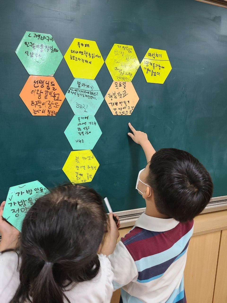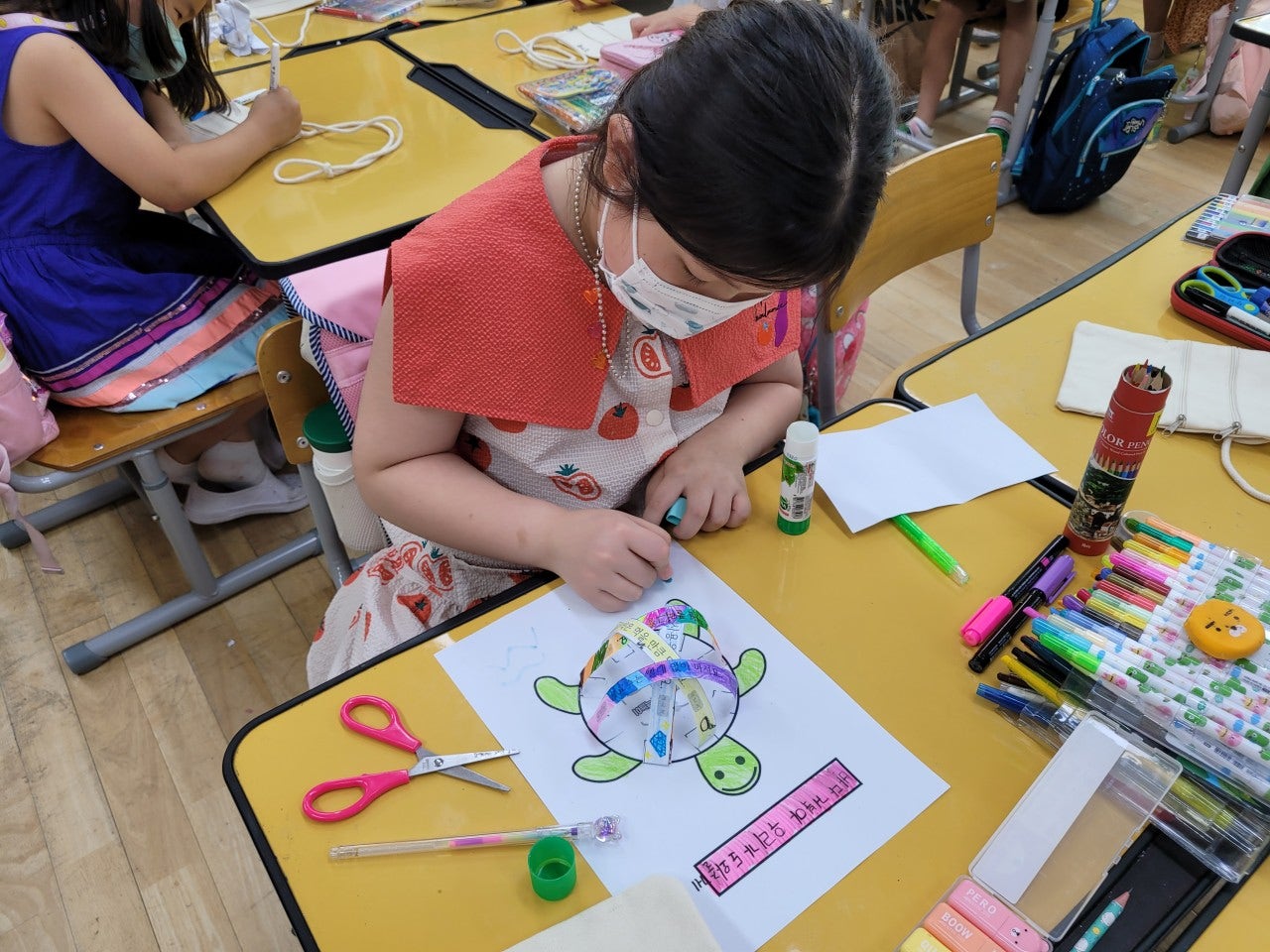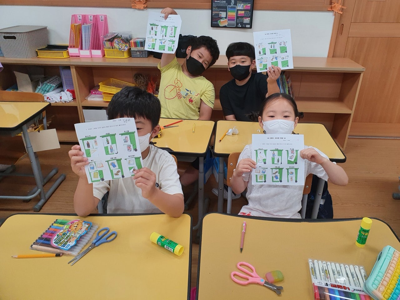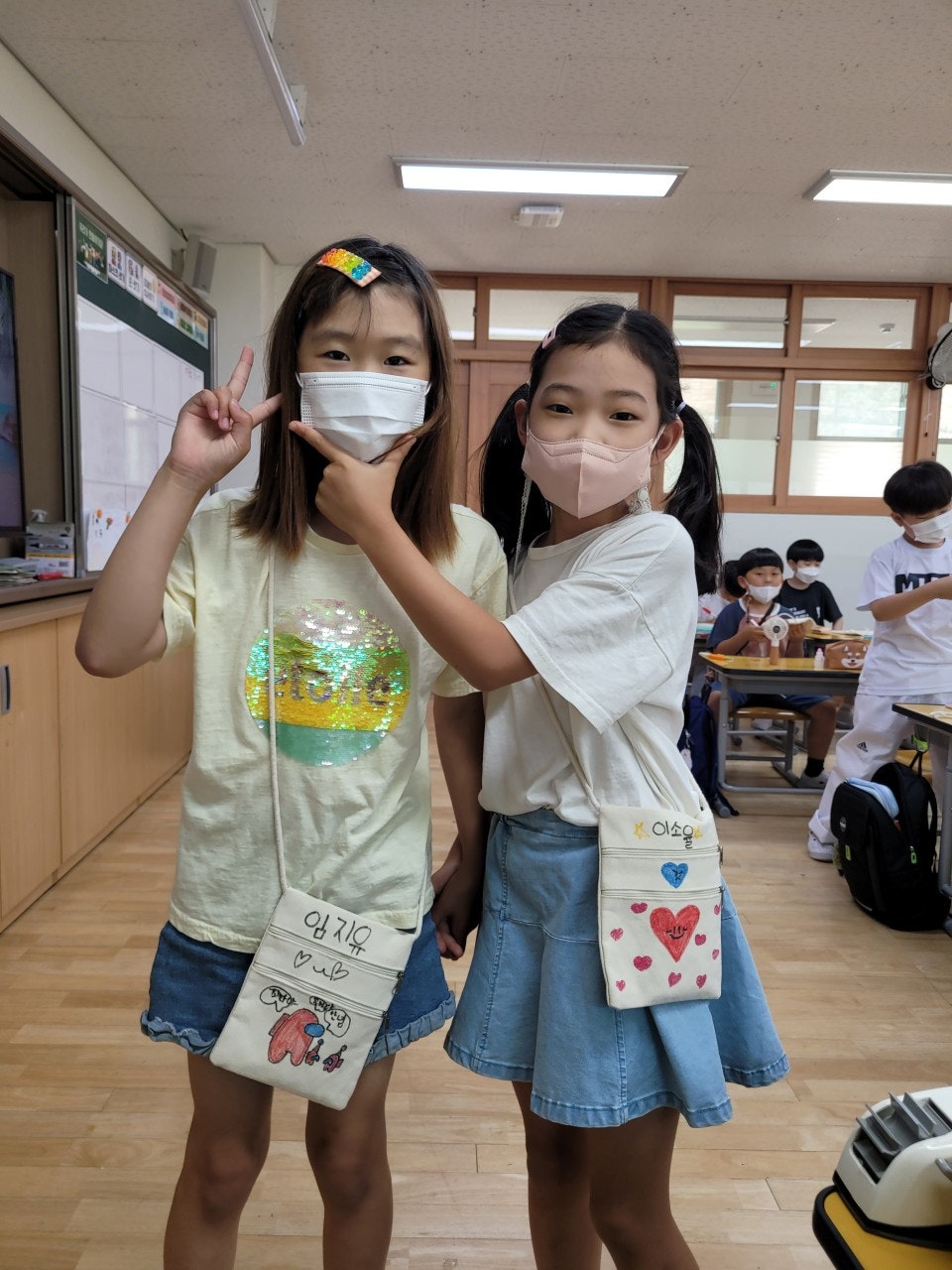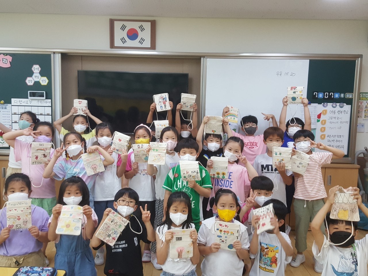 - 푸른 지구를 만들기 위해 나만의 미니백을 만들어 일회용품 사용을 줄이기 위한 다짐을 하였습니다. 학급마다 '친구 사랑', '환경 보호' 등 다양한 주제를 가지고 POP 수업 시간에 배운 글씨를 직접 쓰고 그림을 그려 나만의 미니백을 만들어 멋진 기념사진도 찍었습니다.