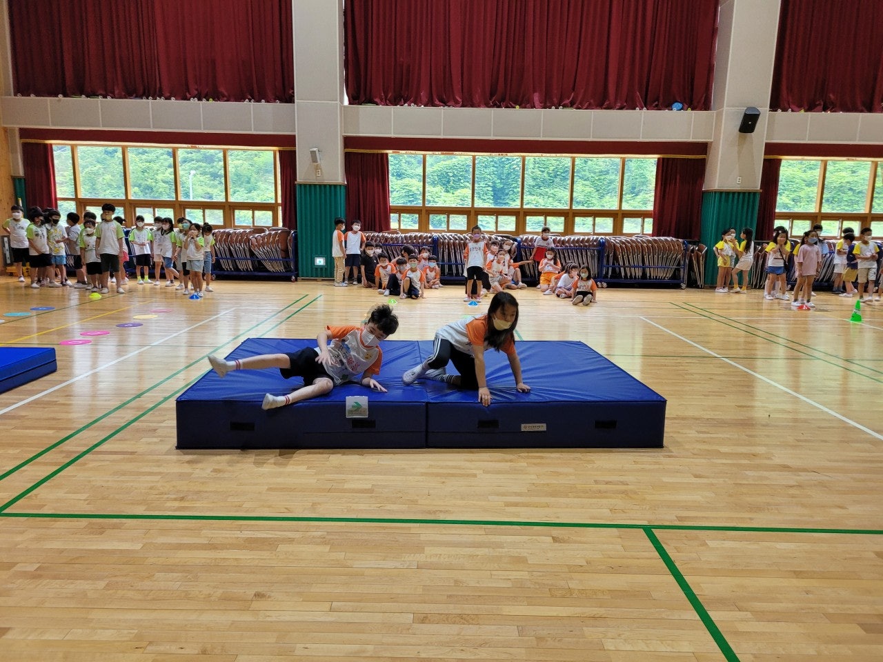 - 학급별로 봄 행복학교에서 만든 반티를 입고 체육관에 모여 장애물 달리기와 뉴스포츠(플라잉디스크, 토스볼) 활동 등을 하면서 함께 또는 서로 경쟁하며 배려와 존중의 자세를 익혔습니다.