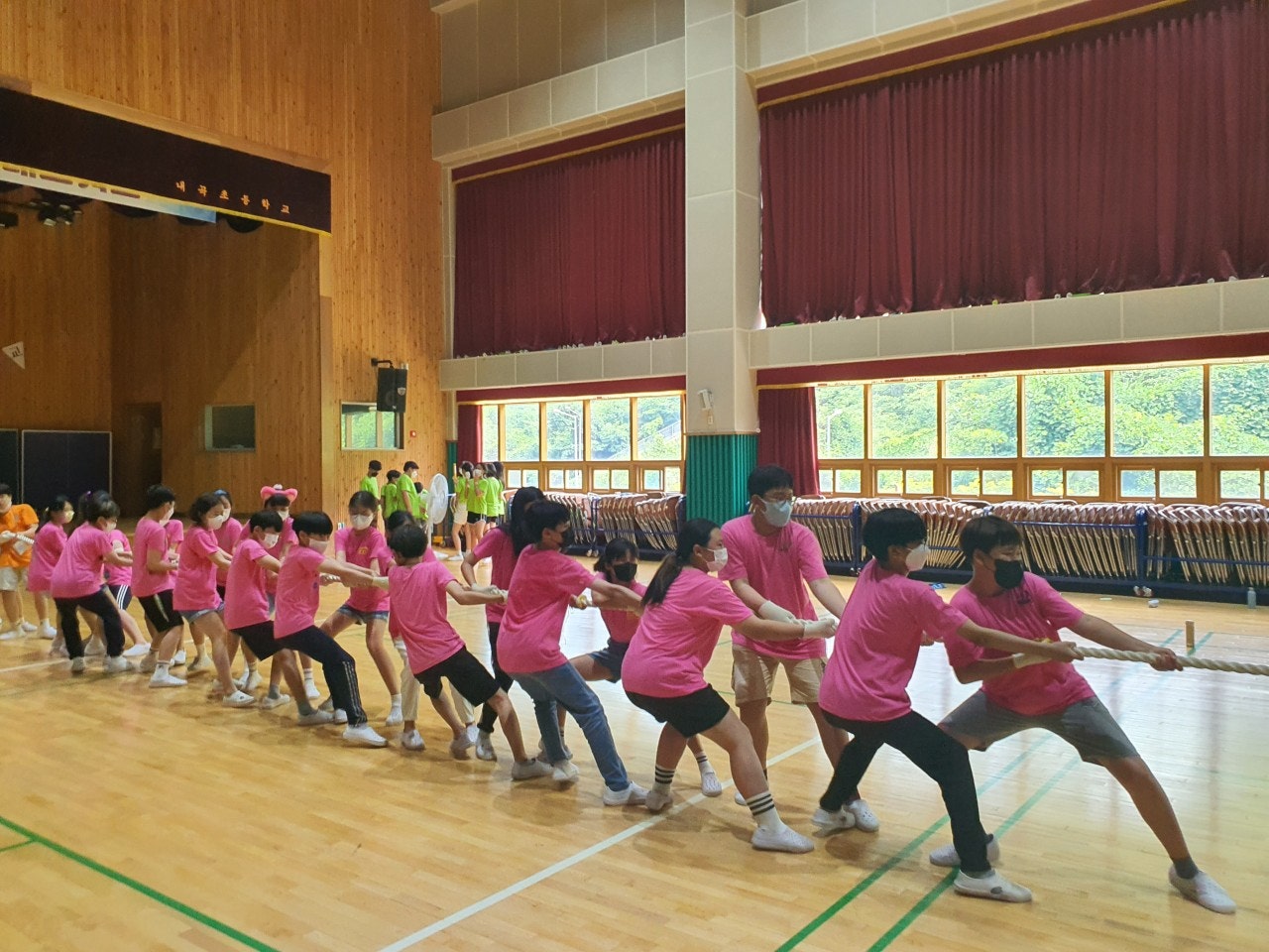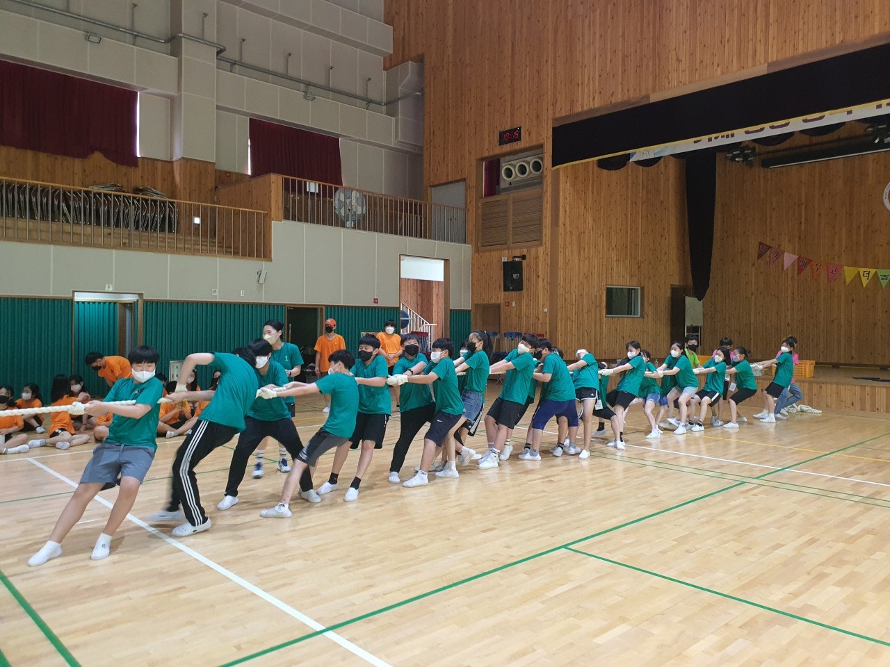 합동레크리에이션의 마무리로 모두 힘을 합쳐야만 이길 수 있는 줄다리기를 하였습니다. 반 친구들끼리 모여 전략을 짜고 구호를 외치는 등 열심히 참여했습니다.