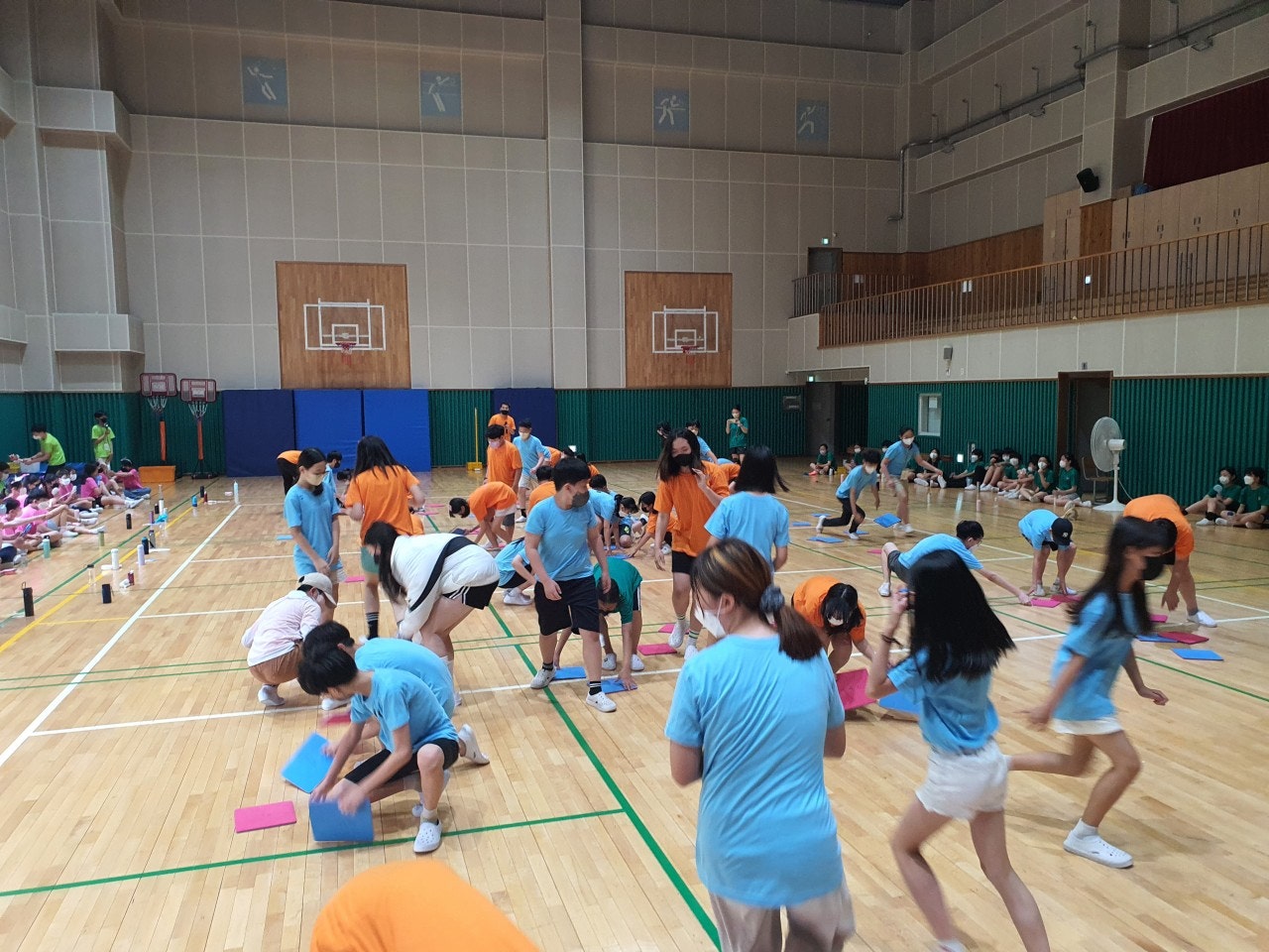 : 합동레크리에이션을 진행하며 다치지않도록 준비체조를 열심히 하였습니다.