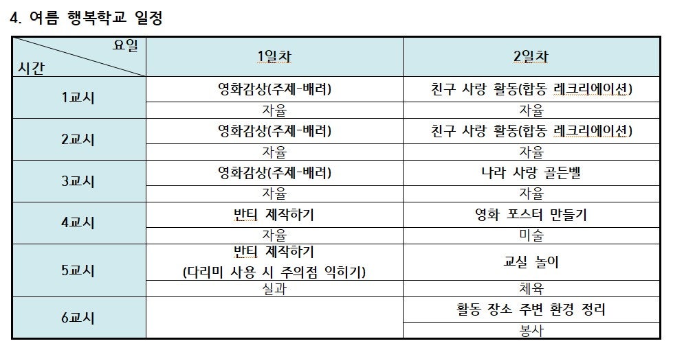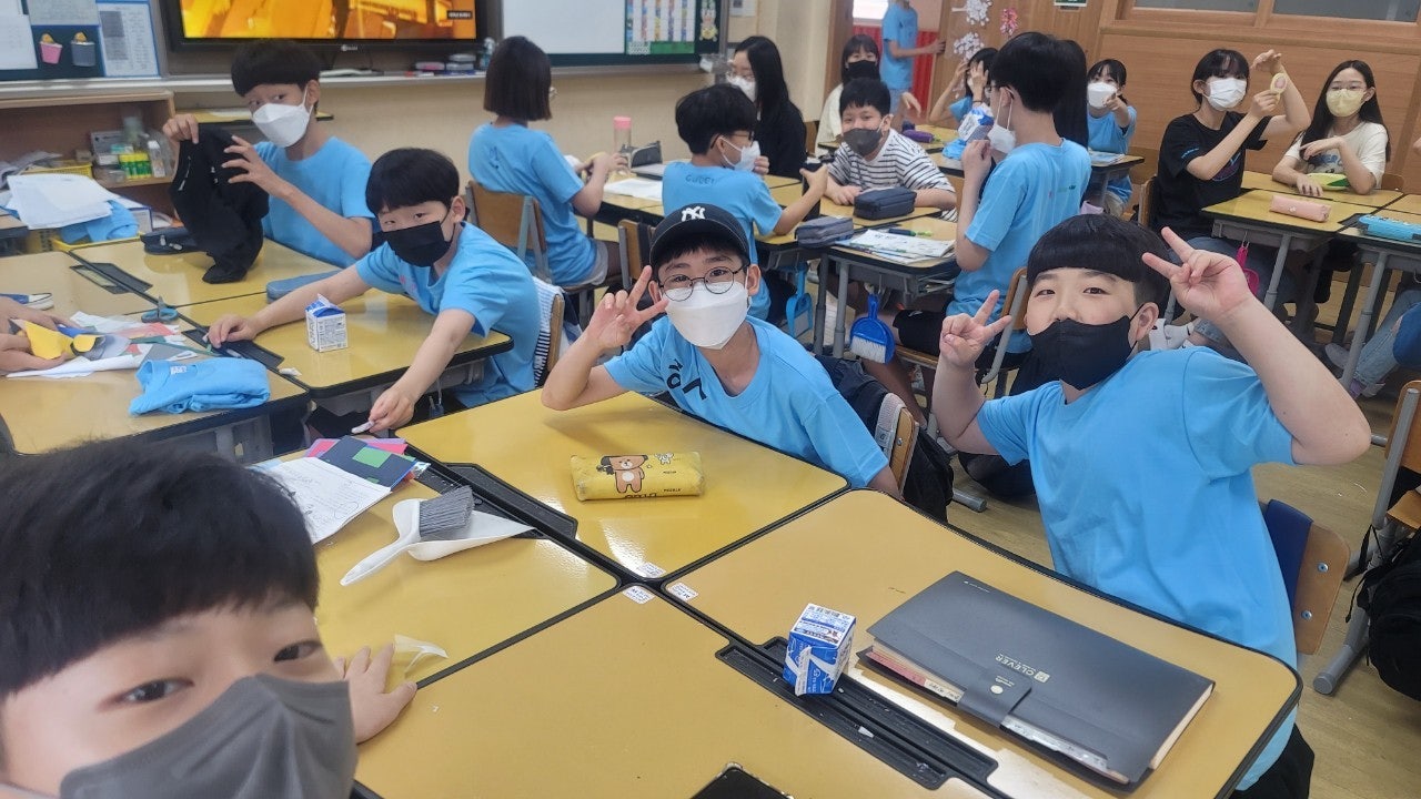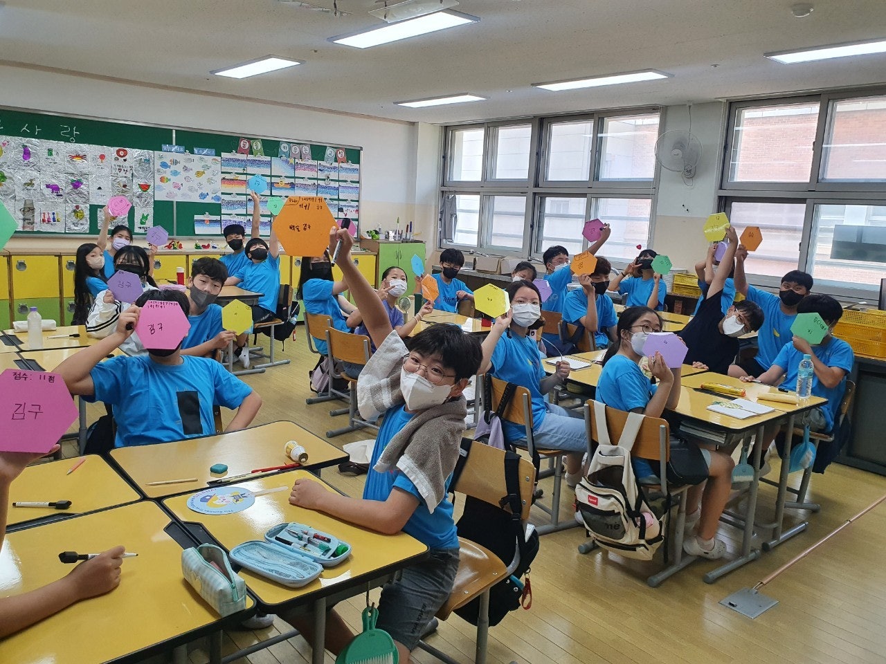 1~10반 모두 각 반의 개성을 살려 염색종이로 반티를 꾸몄습니다. 같은 색깔의 반티를 입고 여름행복학교 활동을 진행하니 학생들이 '우리는 하나'라는 소속감을 가지고 서로 존중하는 모습이 예뻤습니다.