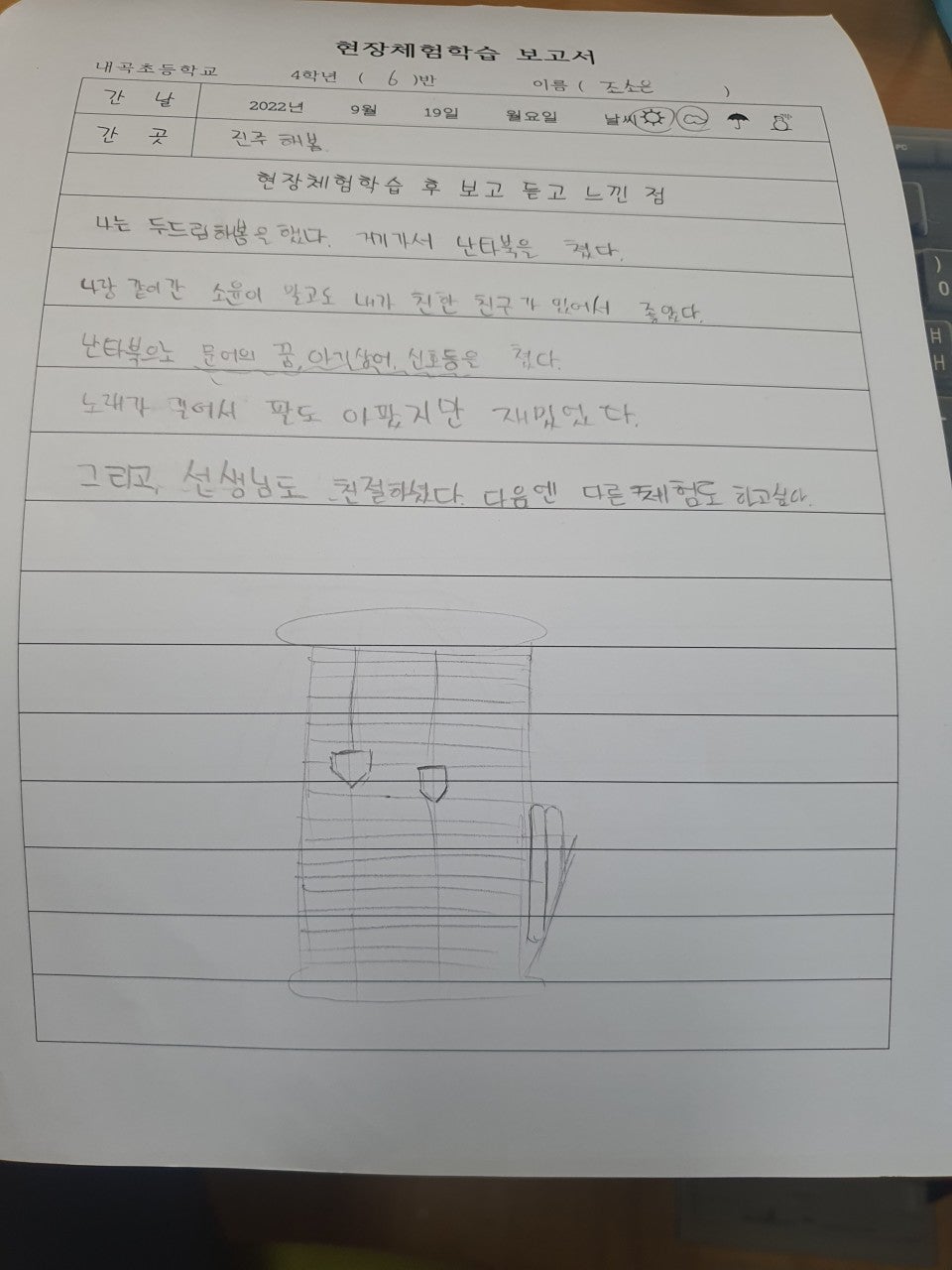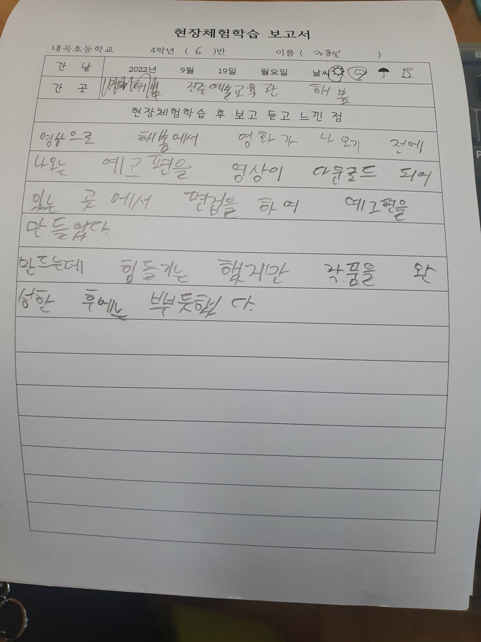4)현장체험학습 보고서 쓰기: 체험활동에 다녀와서 느낀 점, 알게 된 점 등을 담은 보고서를 작성하였다.