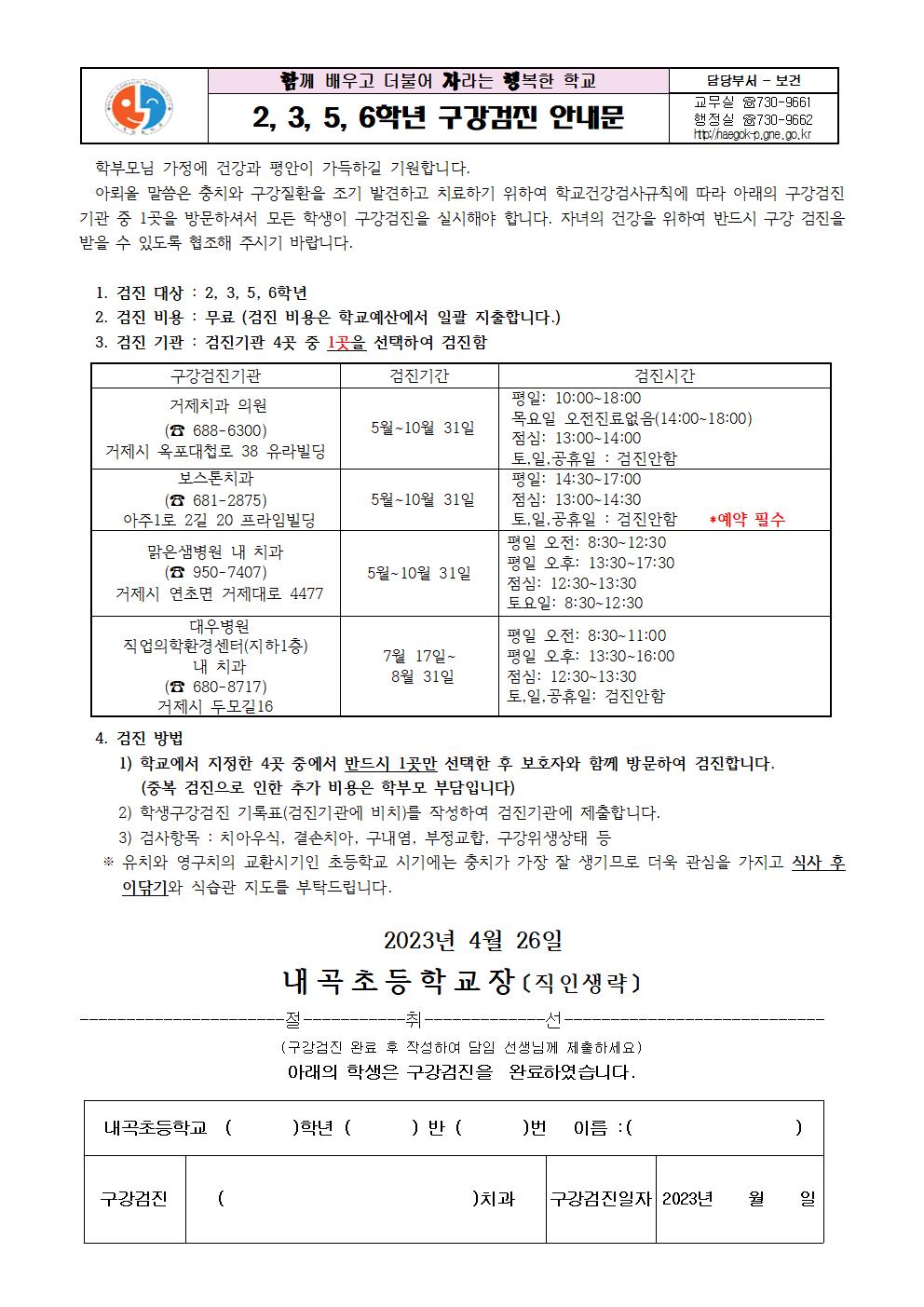2023학년도 2,3,5,6학년 구강검진 안내문